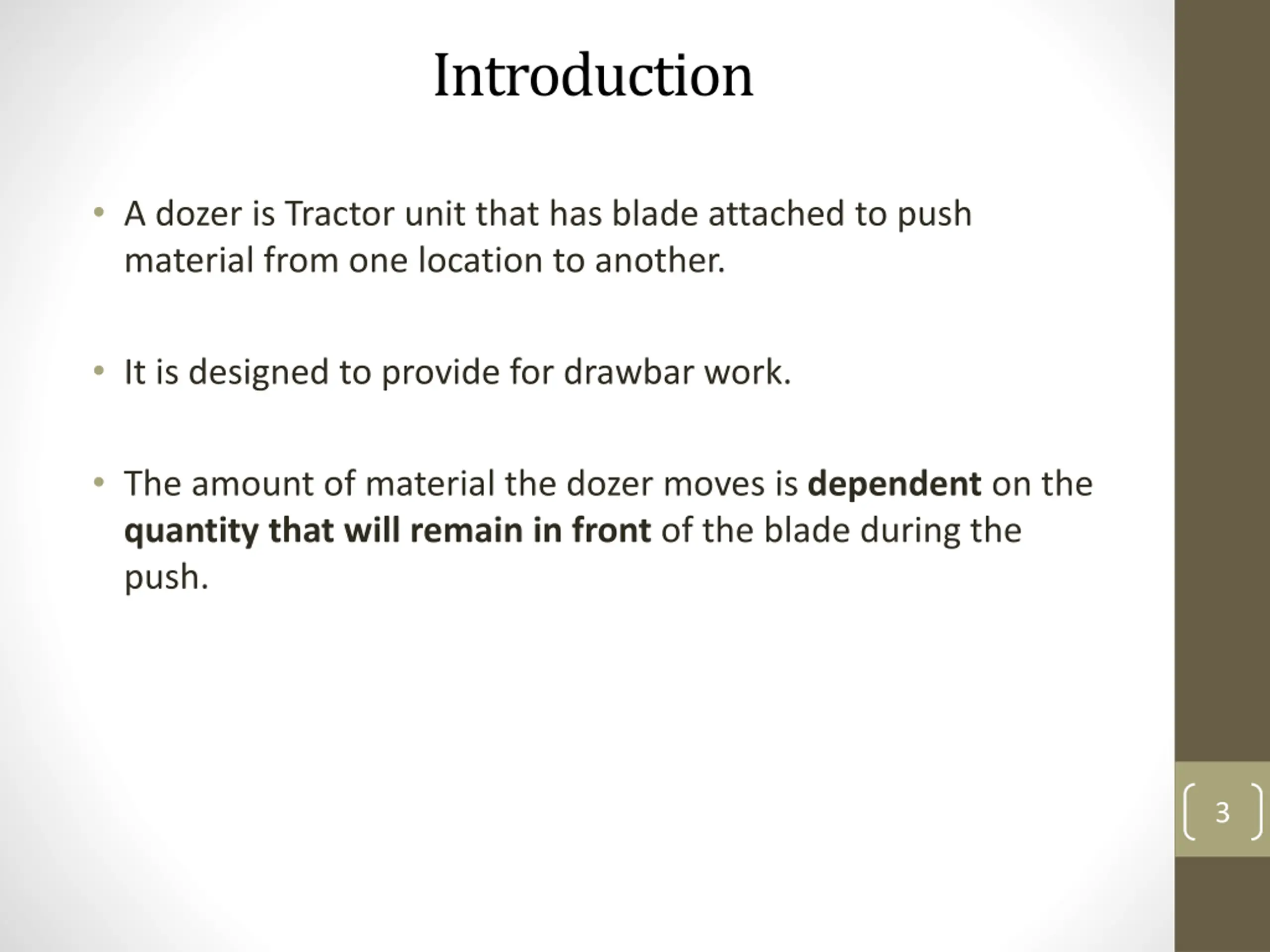 Introduction A dozer is Tractor unit that has blade attached to push material from one location to another. It is designed to provide for drawbar work. The amount of material the dozer moves is dependent on the quantity that will remain in front of the blade during the push. 3