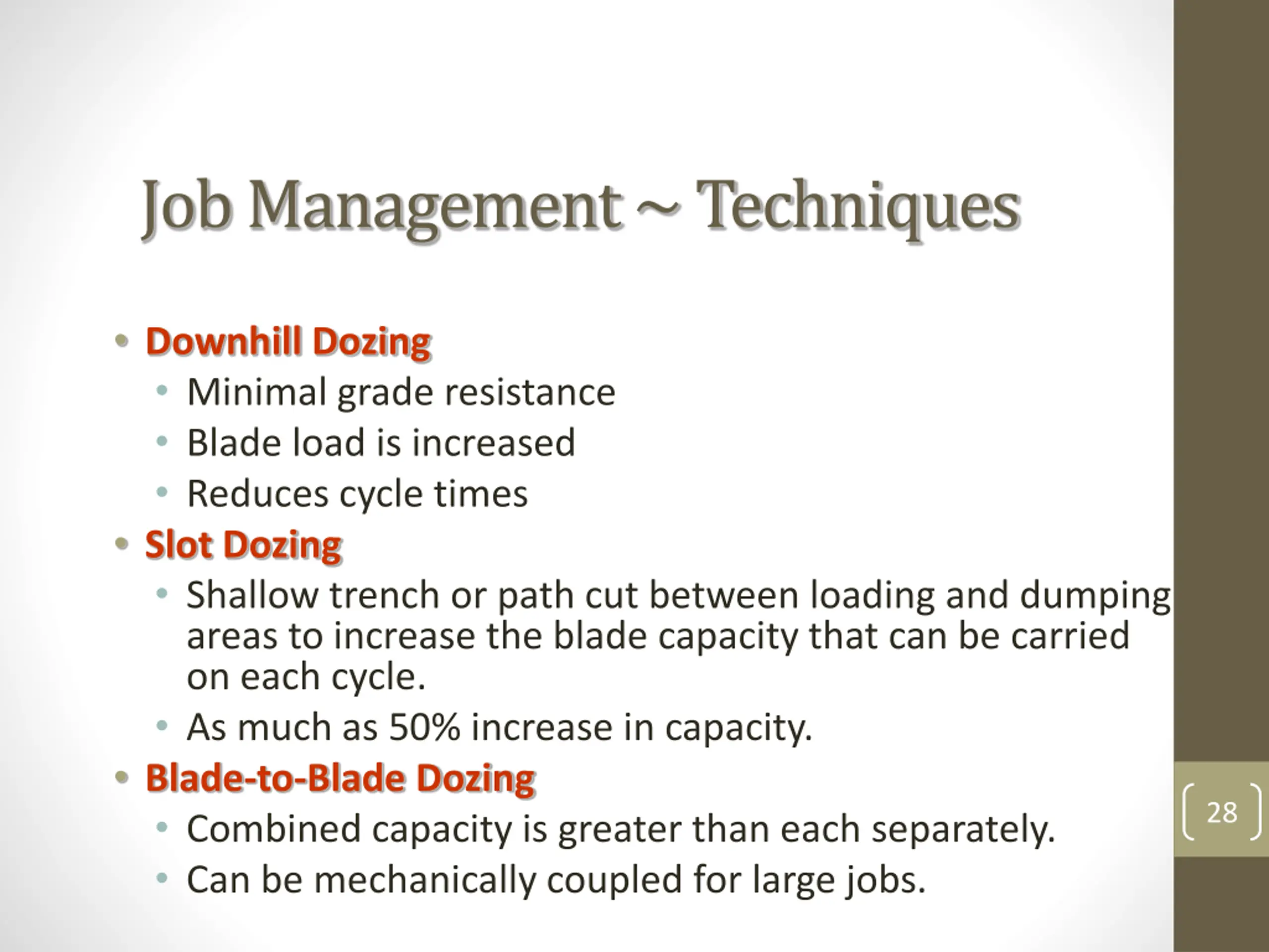 Job Management ~ Techniques Downhill Dozing Minimal grade resistance Blade load is increased Reduces cycle times Slot Dozing Shallow trench or path cut between loading and dumping areas to increase the blade capacity that can be carried on each cycle. As much as 50% increase in capacity. Blade-to-Blade Dozing Combined capacity is greater than each separately. Can be mechanically coupled for large jobs. 28
