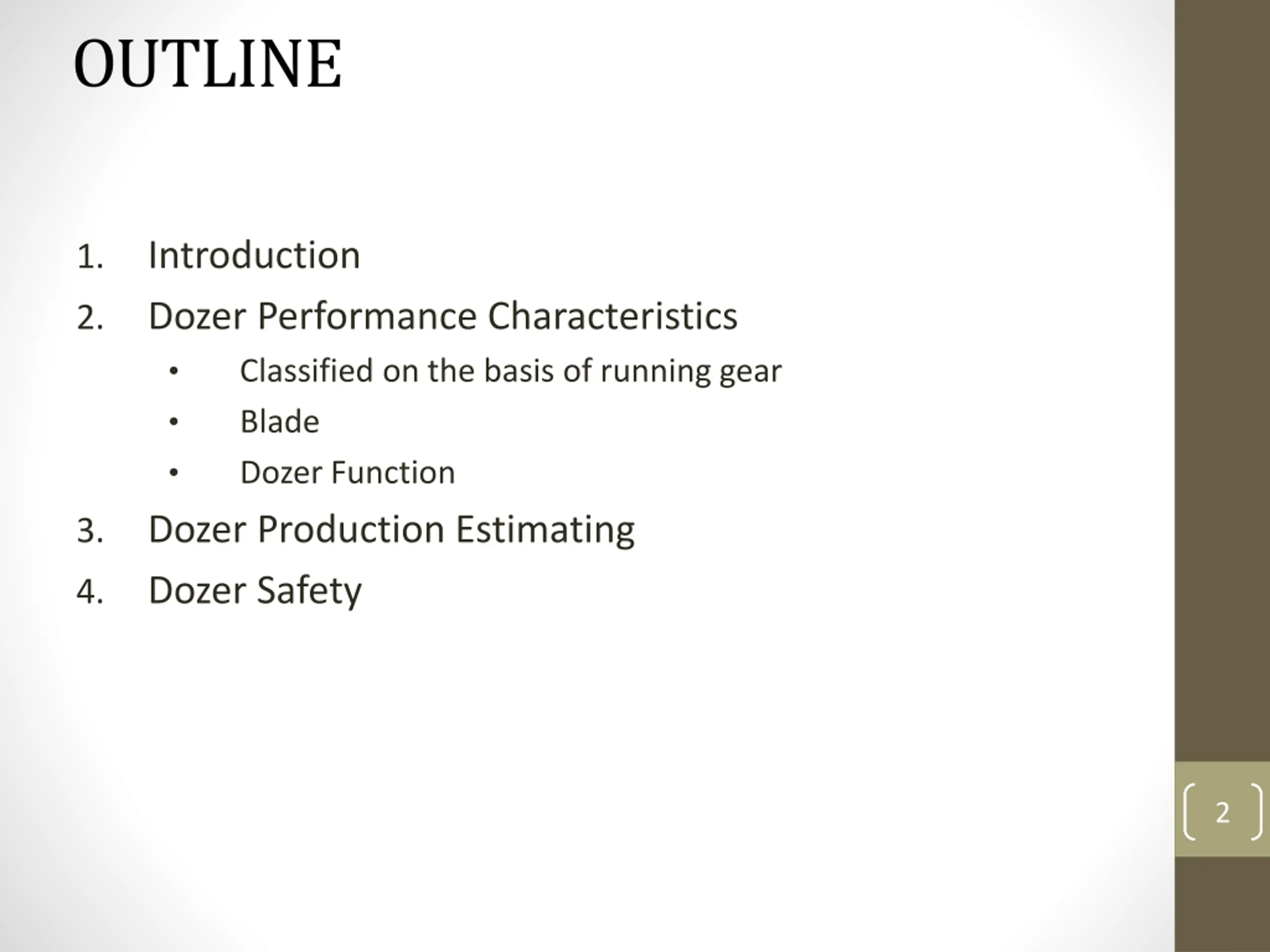 OUTLINE Introduction Dozer Performance Characteristics Classified on the basis of running gear Blade Dozer Function Dozer Production Estimating Dozer Safety 1. 2. 3. 4. 2