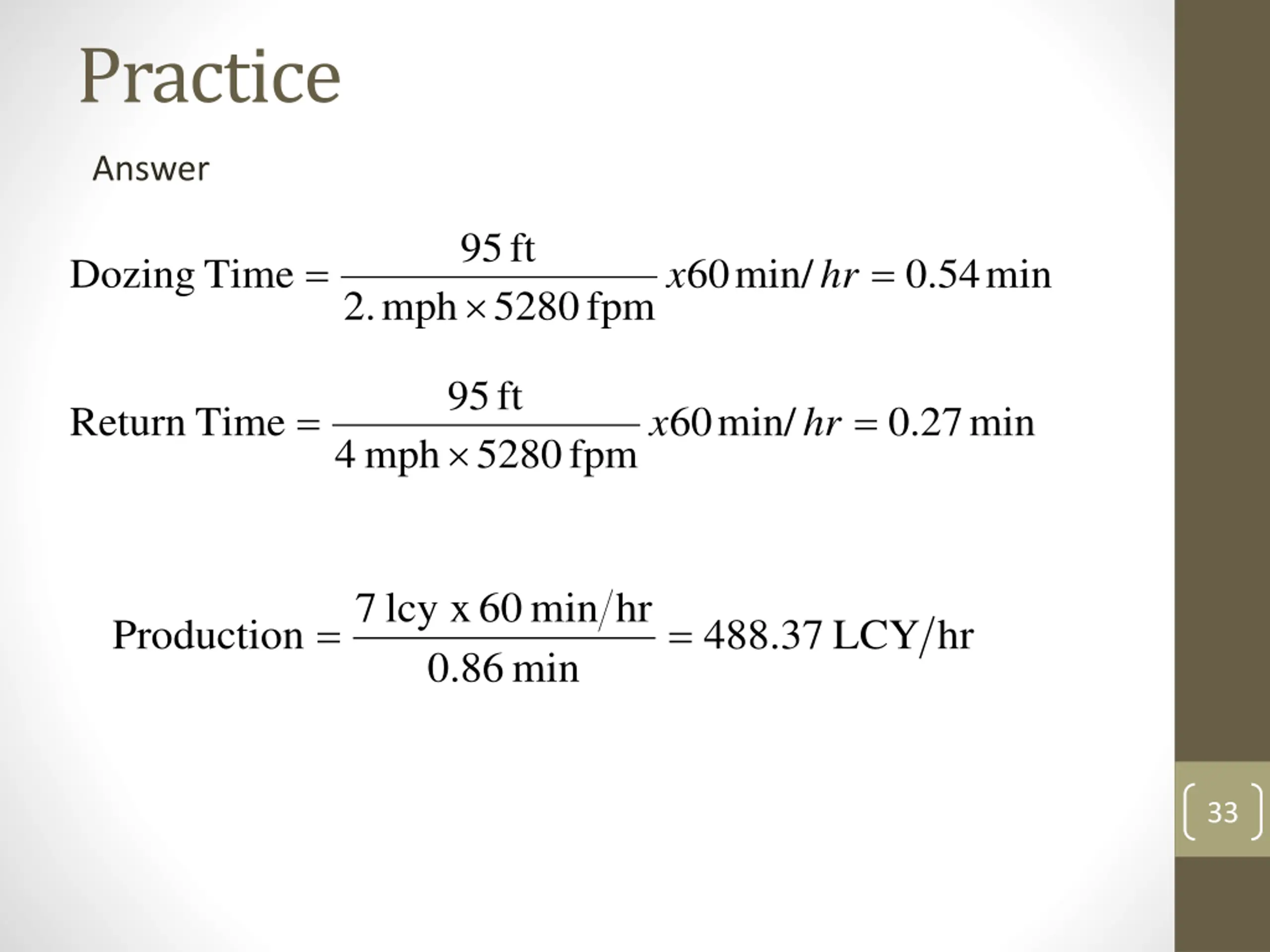 Practice Answer 95 ft = = Dozing Time 60 min/ . 0 54 min x hr mph 2. 5280 fpm 95 ft = = Return Time 60 min/ . 0 27 min x hr mph 4 5280 fpm lcy x 7 60 min hr = = Production 488.37 LCY hr 0.86 min 33