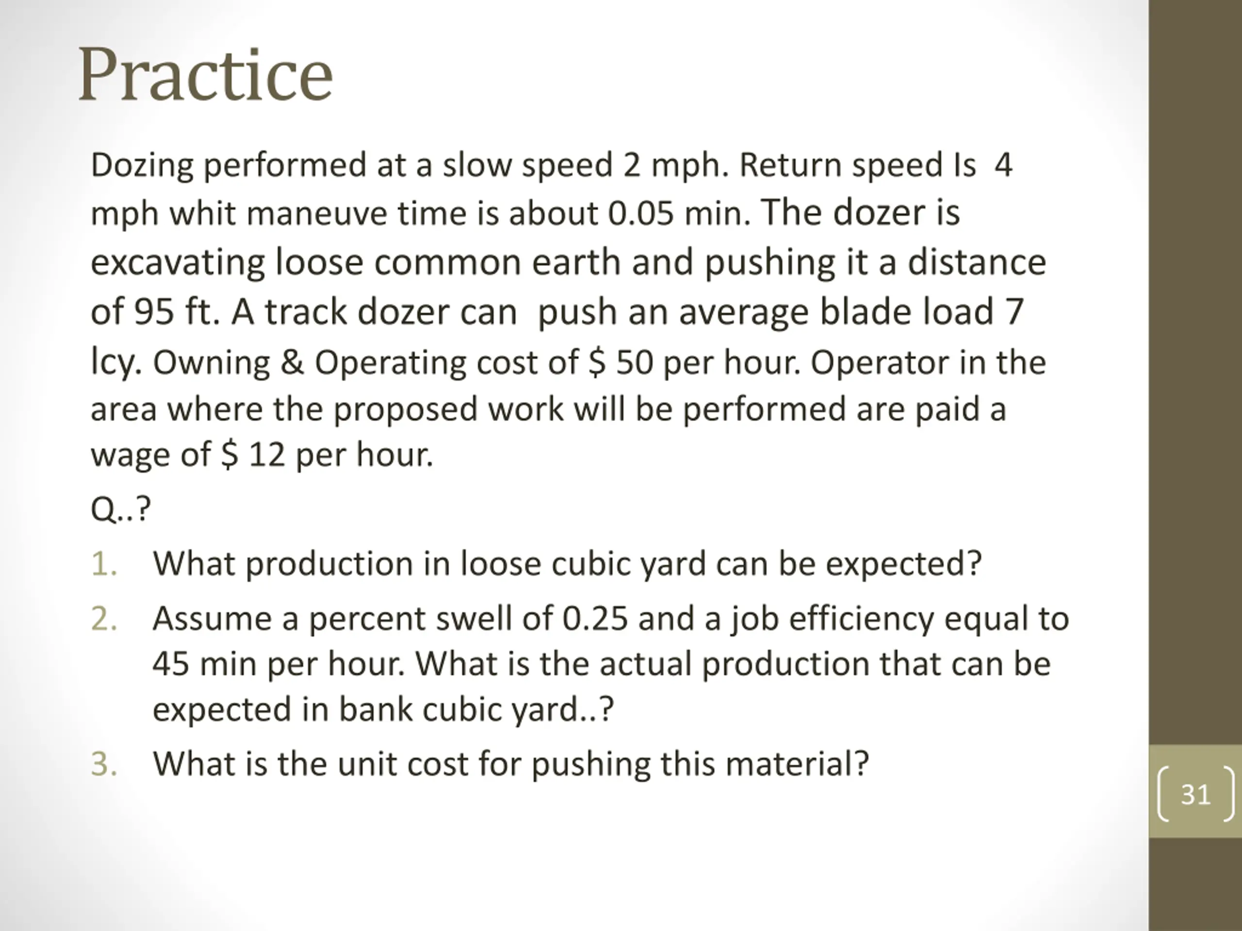 Practice Dozing performed at a slow speed 2 mph. Return speed Is 4 mph whit maneuve time is about 0.05 min. The dozer is excavating loose common earth and pushing it a distance of 95 ft. A track dozer can push an average blade load 7 lcy. Owning & Operating cost of $ 50 per hour. Operator in the area where the proposed work will be performed are paid a wage of $ 12 per hour. Q..? 1. What production in loose cubic yard can be expected? 2. Assume a percent swell of 0.25 and a job efficiency equal to 45 min per hour. What is the actual production that can be expected in bank cubic yard..? 3. What is the unit cost for pushing this material? 31