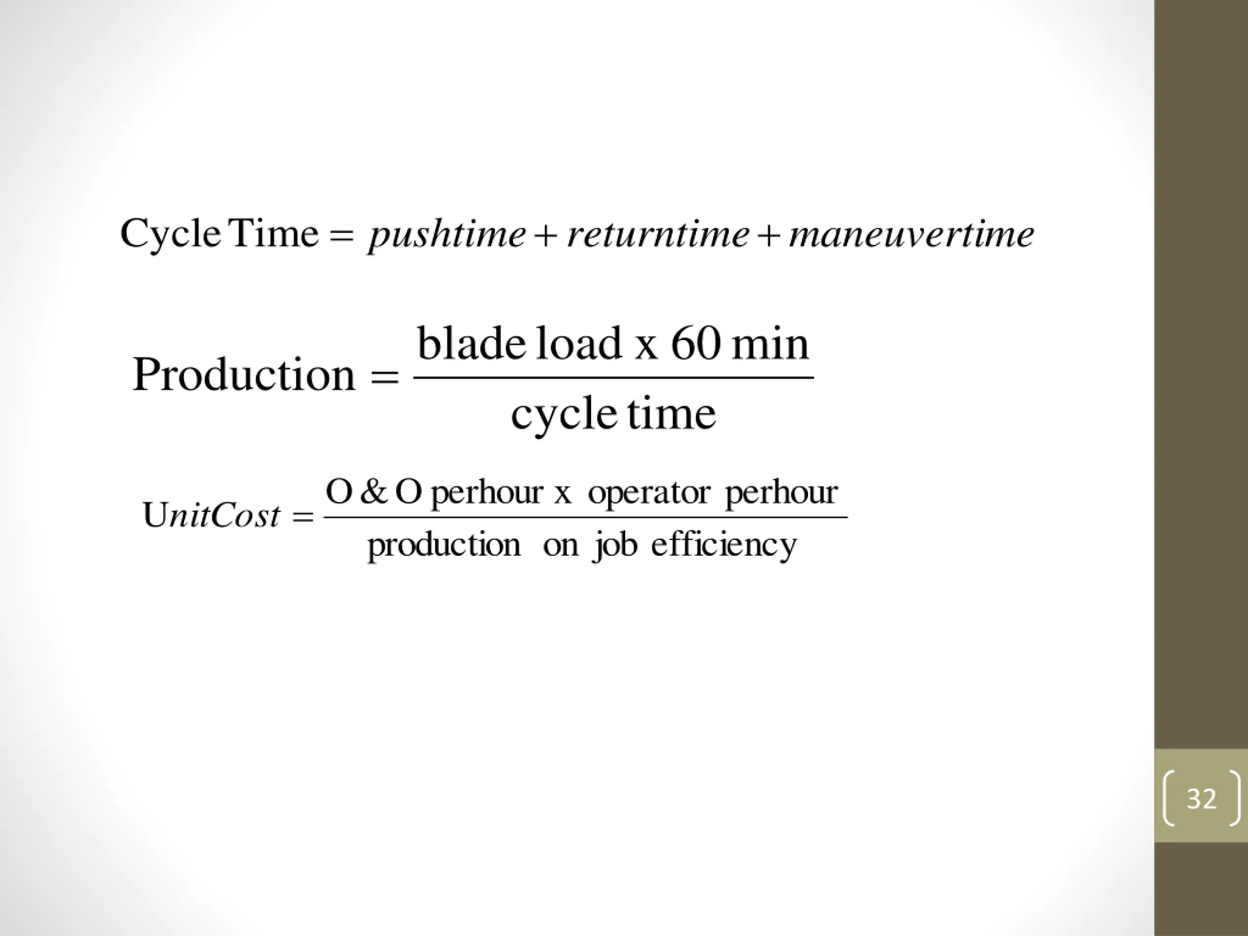 = + + Cycle Time pushtime returntime maneuverti me blade load x 60 min Production = cycle time O & perhour x O operator perhour = U nitCost production on job efficiency 32