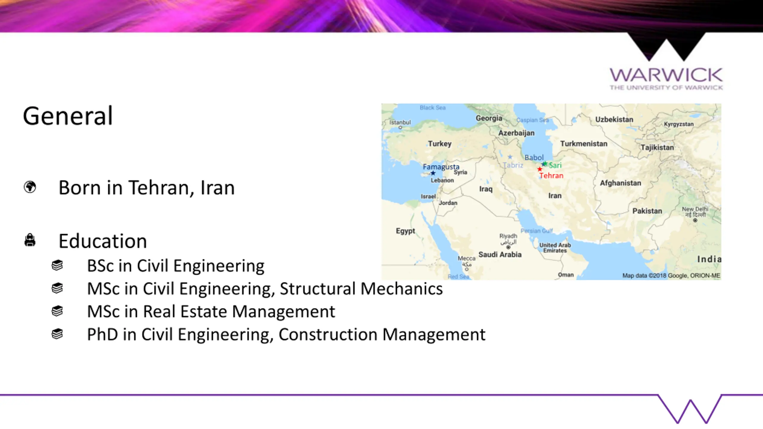 General Babol Tabriz Sari Famagusta Tehran Born in Tehran, Iran Education BSc in Civil Engineering MSc in Civil Engineering, Structural Mechanics MSc in Real Estate Management PhD in Civil Engineering, Construction Management