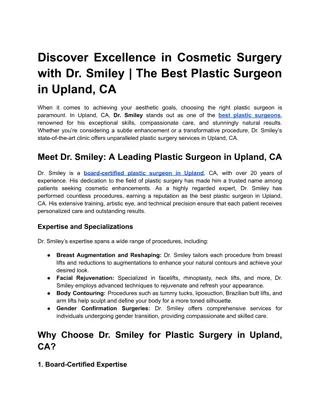 Dr. Smiley, one of the best plastic surgeons in Beverly Hills, offers top-tier cosmetic procedures tailored to your aesthetic goals. Specializing in body contouring, facial rejuvenation, and comprehensive makeovers, Dr. Smiley provides exceptional, personalized results. Key procedures include tummy tucks, liposuction, Brazilian Butt Lifts, breast augmentations, facelifts, and rhinoplasties. He also offers specialized surgeries like revision procedures and Mommy Makeovers. Contact Dr. Smileyu2019s offices in Beverly Hills or Upland for consultations and transform your aesthetic vision into reality.