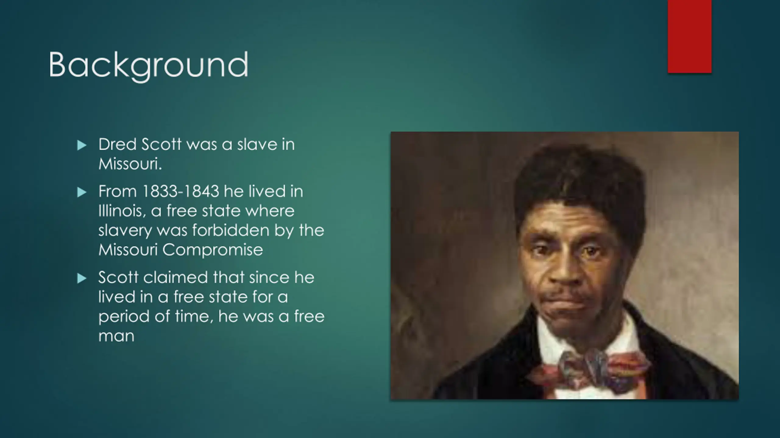 Background Dred Scott was a slave in Missouri. From 1833-1843 he lived in Illinois, a free state where slavery was forbidden by the Missouri Compromise Scott claimed that since he lived in a free state for a period of time, he was a free man