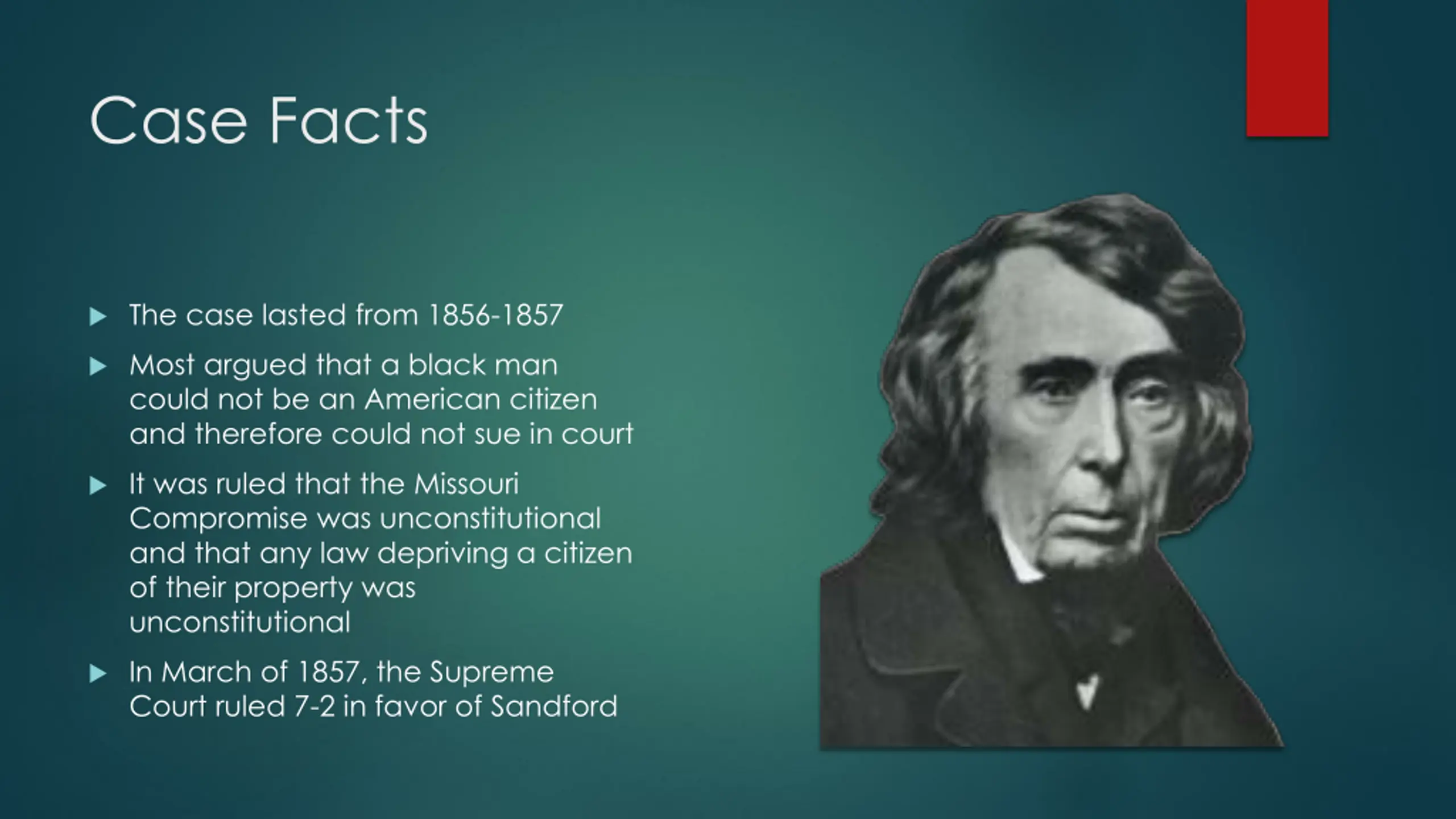Case Facts The case lasted from 1856-1857 Most argued that a black man could not be an American citizen and therefore could not sue in court It was ruled that the Missouri Compromise was unconstitutional and that any law depriving a citizen of their property was unconstitutional In March of 1857, the Supreme Court ruled 7-2 in favor of Sandford