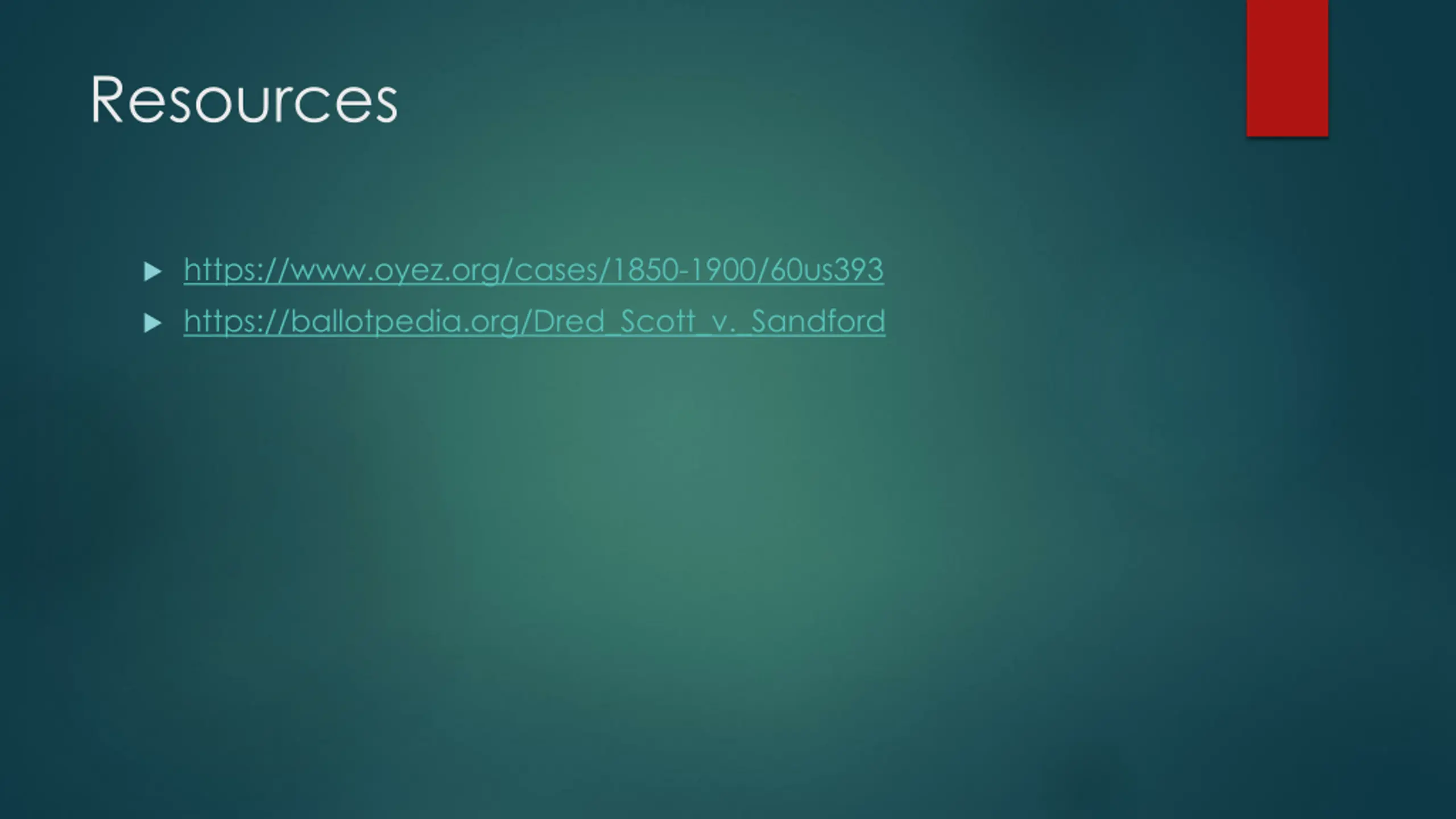 Resources https://www.oyez.org/cases/1850-1900/60us393 https://ballotpedia.org/Dred_Scott_v._Sandford