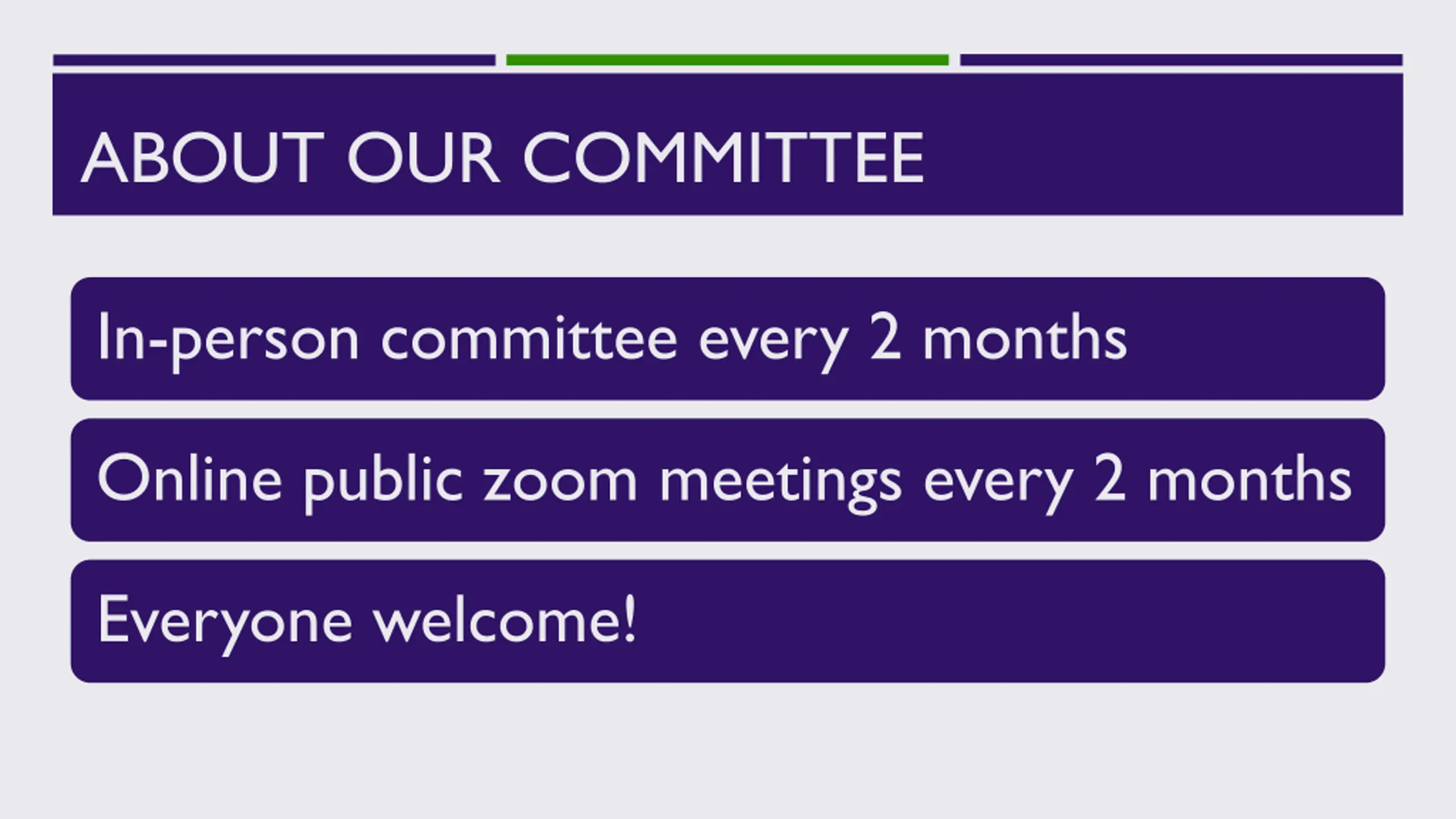 ABOUT OUR COMMITTEE In-person committee every 2 months Online public zoom meetings every 2 months Everyone welcome!