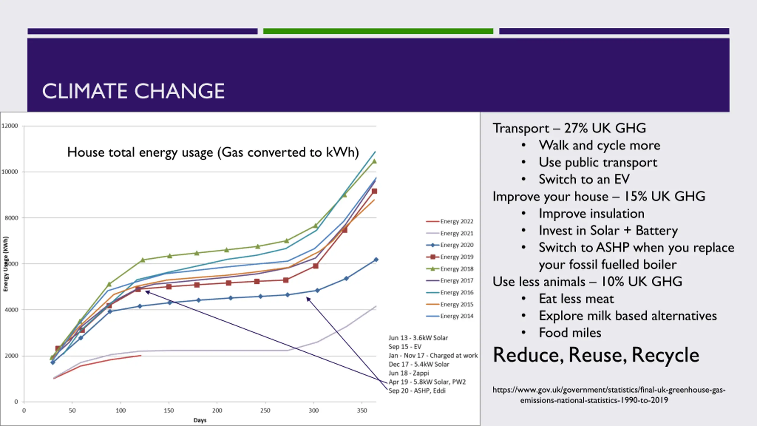 CLIMATE CHANGE Transport 27% UK GHG Walk and cycle more Use public transport Switch to an EV Improve your house 15% UK GHG Improve insulation Invest in Solar + Battery Switch to ASHP when you replace your fossil fuelled boiler Use less animals 10% UK GHG Eat less meat Explore milk based alternatives Food miles Reduce, Reuse, Recycle House total energy usage (Gas converted to kWh) https://www.gov.uk/government/statistics/final-uk-greenhouse-gas- emissions-national-statistics-1990-to-2019