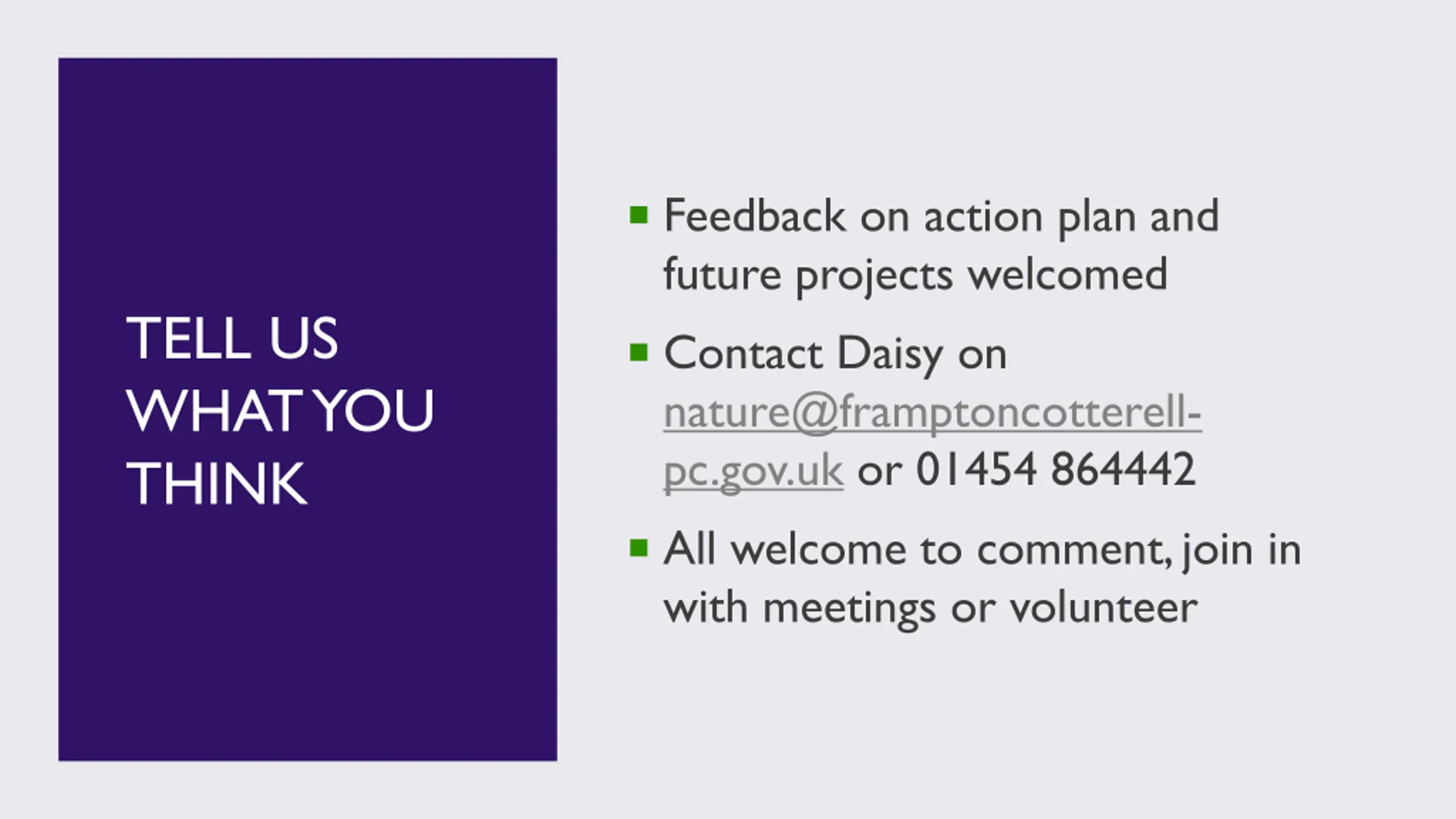 Feedback on action plan and future projects welcomed TELL US WHAT YOU THINK Contact Daisy on nature@framptoncotterell- pc.gov.uk or 01454 864442 All welcome to comment, join in with meetings or volunteer