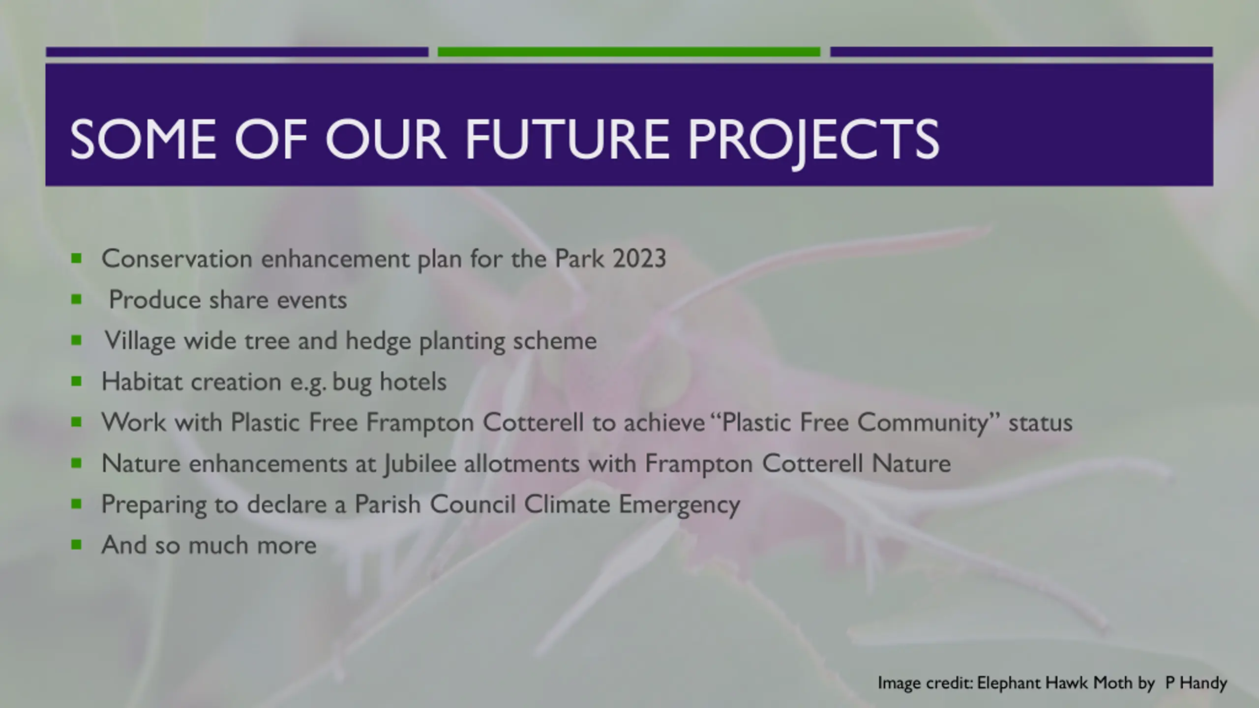 SOME OF OUR FUTURE PROJECTS Conservation enhancement plan for the Park 2023 Produce share events Village wide tree and hedge planting scheme Habitat creation e.g. bug hotels Work with Plastic Free Frampton Cotterell to achieve Plastic Free Community status Nature enhancements at Jubilee allotments with Frampton Cotterell Nature Preparing to declare a Parish Council Climate Emergency And so much more Image credit: Elephant Hawk Moth by P Handy