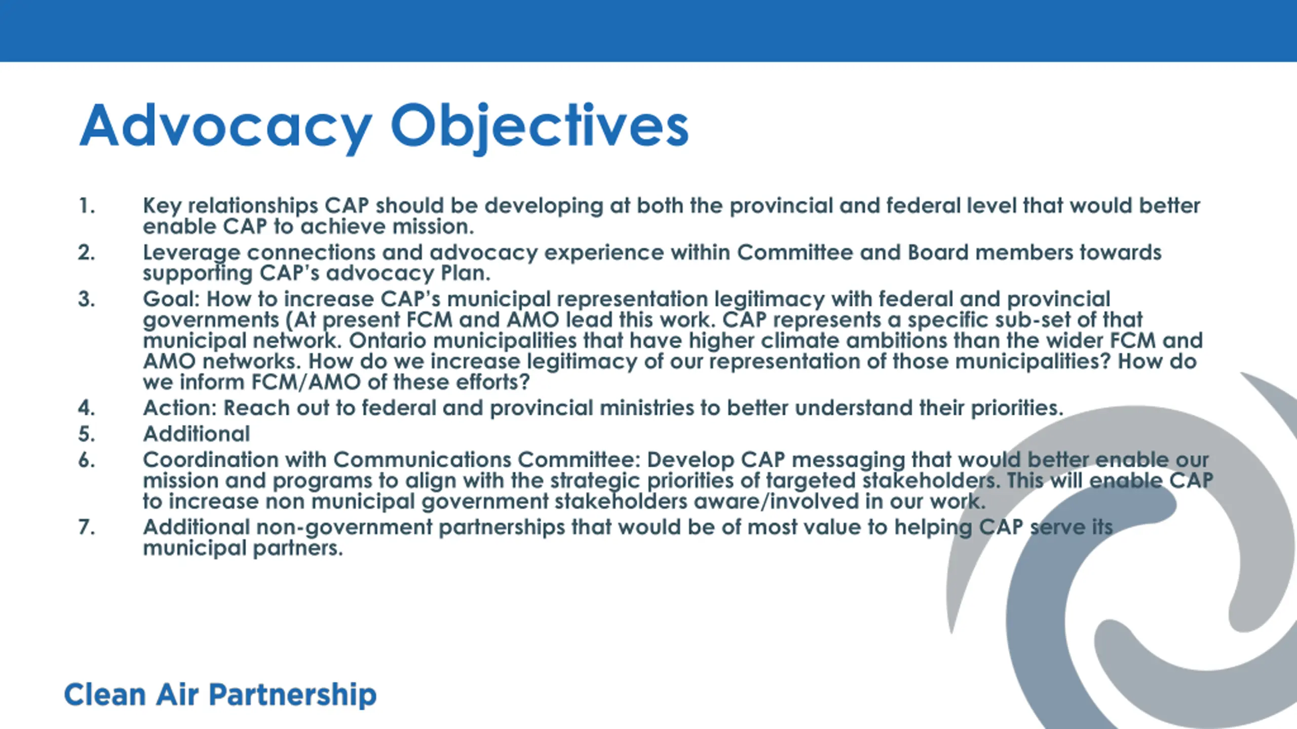 Advocacy Objectives 1. Key relationships CAP should be developing at both the provincial and federal level that would better enable CAP to achieve mission. Leverage connections and advocacy experience within Committee and Board members towards supporting CAP s advocacy Plan. Goal: How to increase CAP s municipal representation legitimacy with federal and provincial governments (At present FCM and AMO lead this work. CAP represents a specific sub-set of that municipal network. Ontario municipalities that have higher climate ambitions than the wider FCM and AMO networks. How do we increase legitimacy of our representation of those municipalities? How do we inform FCM/AMO of these efforts? Action: Reach out to federal and provincial ministries to better understand their priorities. Additional Coordination with Communications Committee: Develop CAP messaging that would better enable our mission and programs to align with the strategic priorities of targeted stakeholders. This will enable CAP to increase non municipal government stakeholders aware/involved in our work. Additional non-government partnerships that would be of most value to helping CAP serve its municipal partners. 2. 3. 4. 5. 6. 7.