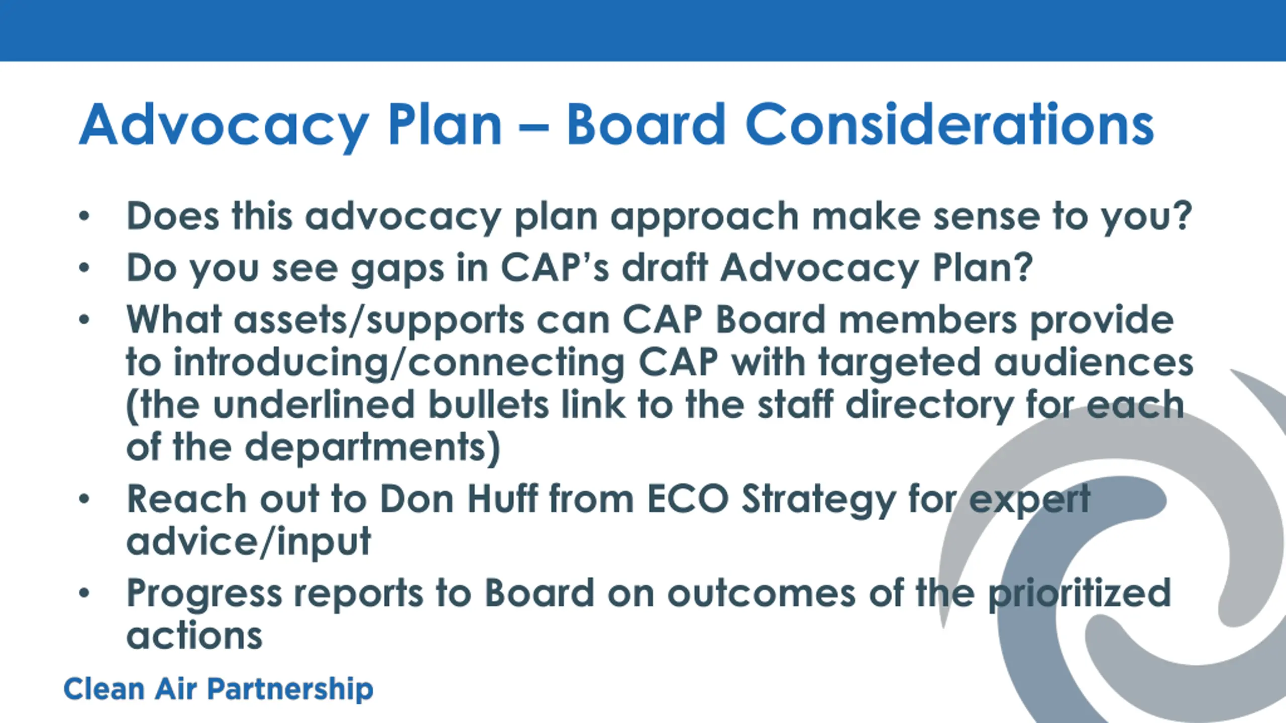 Advocacy Plan Board Considerations Does this advocacy plan approach make sense to you? Do you see gaps in CAP s draft Advocacy Plan? What assets/supports can CAP Board members provide to introducing/connecting CAP with targeted audiences (the underlined bullets link to the staff directory for each of the departments) Reach out to Don Huff from ECO Strategy for expert advice/input Progress reports to Board on outcomes of the prioritized actions