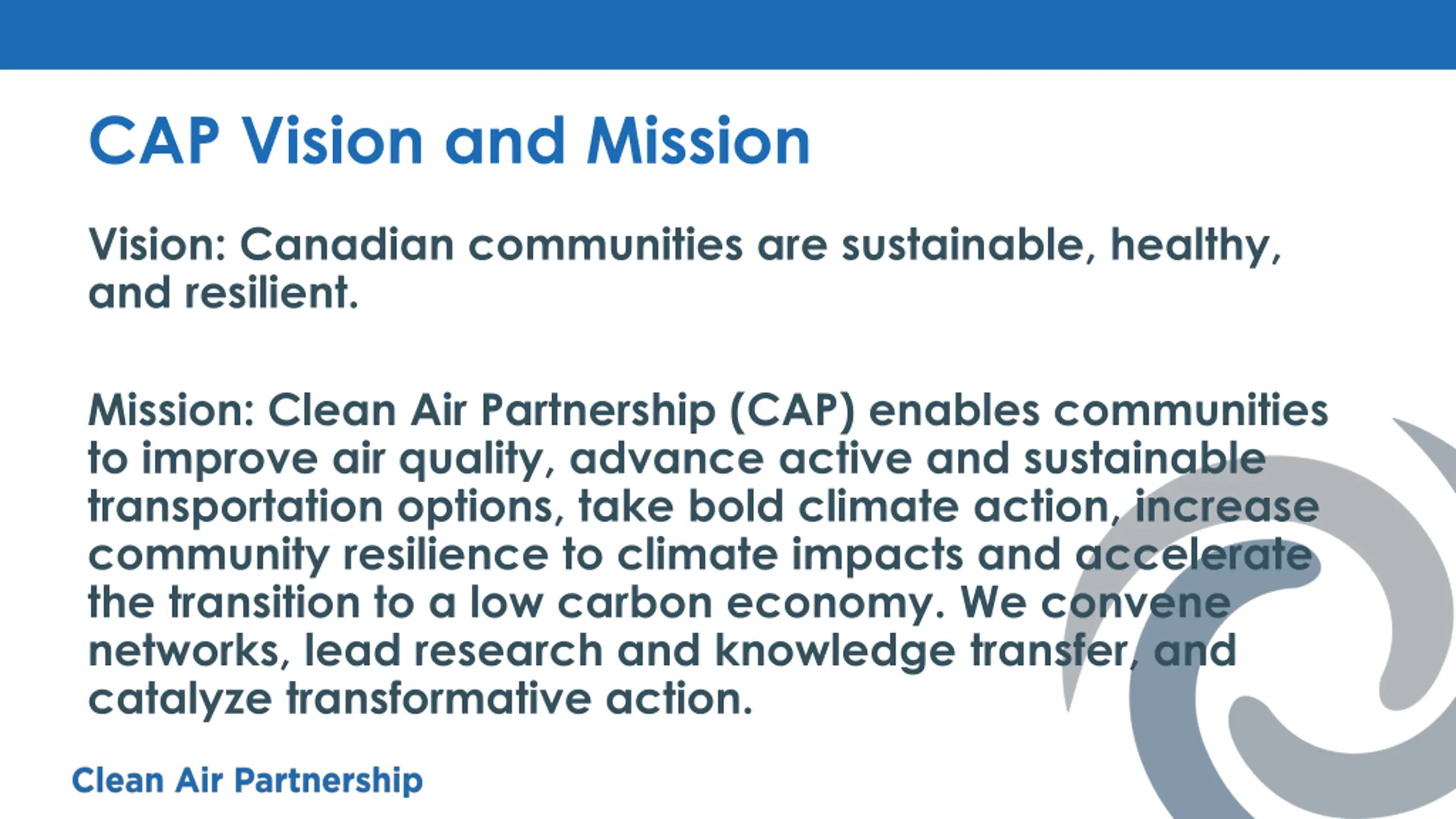 CAP Vision and Mission Vision: Canadian communities are sustainable, healthy, and resilient. Mission: Clean Air Partnership (CAP) enables communities to improve air quality, advance active and sustainable transportation options, take bold climate action, increase community resilience to climate impacts and accelerate the transition to a low carbon economy. We convene networks, lead research and knowledge transfer, and catalyze transformative action.