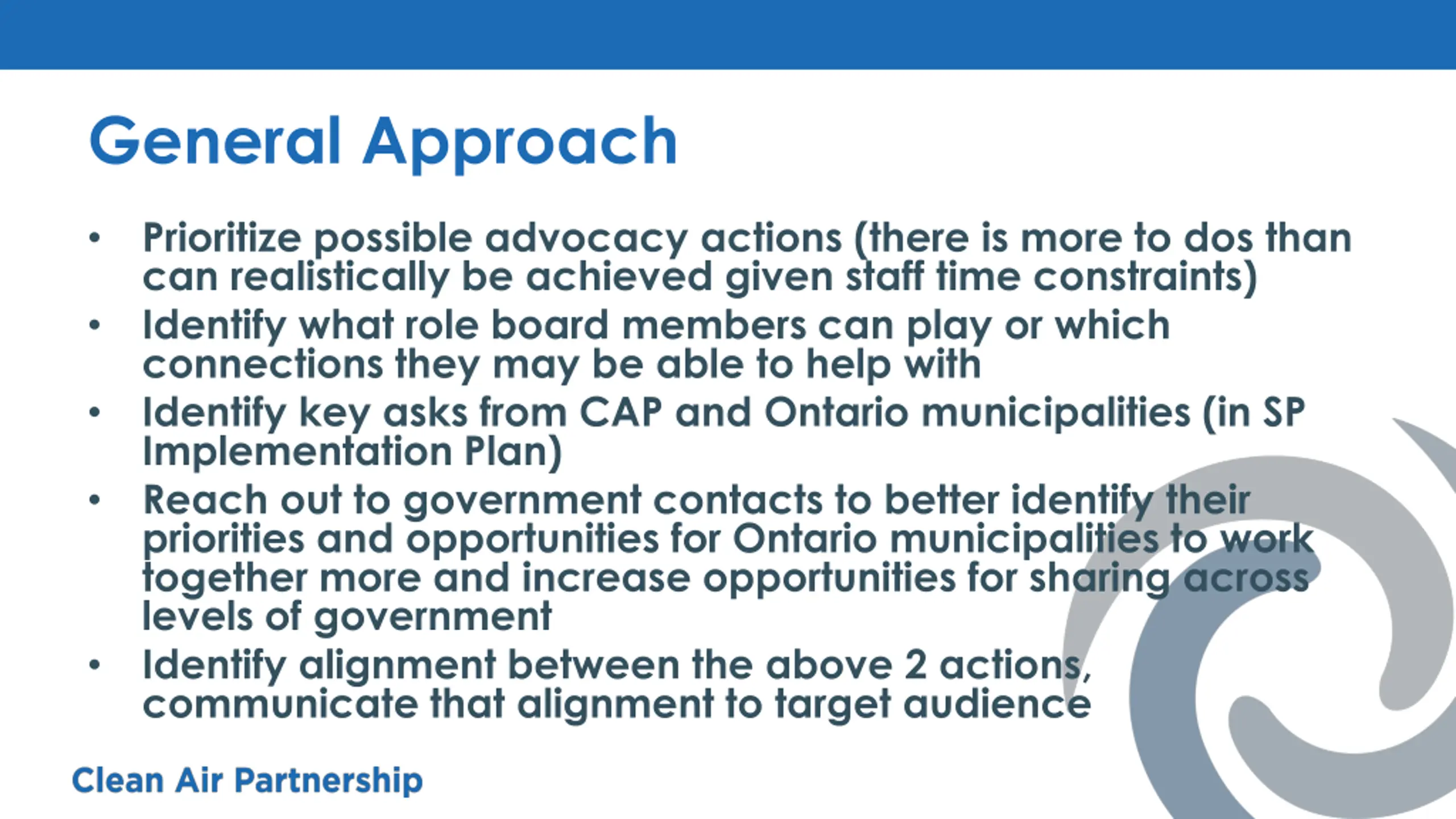 General Approach Prioritize possible advocacy actions (there is more to dos than can realistically be achieved given staff time constraints) Identify what role board members can play or which connections they may be able to help with Identify key asks from CAP and Ontario municipalities (in SP Implementation Plan) Reach out to government contacts to better identify their priorities and opportunities for Ontario municipalities to work together more and increase opportunities for sharing across levels of government Identify alignment between the above 2 actions, communicate that alignment to target audience