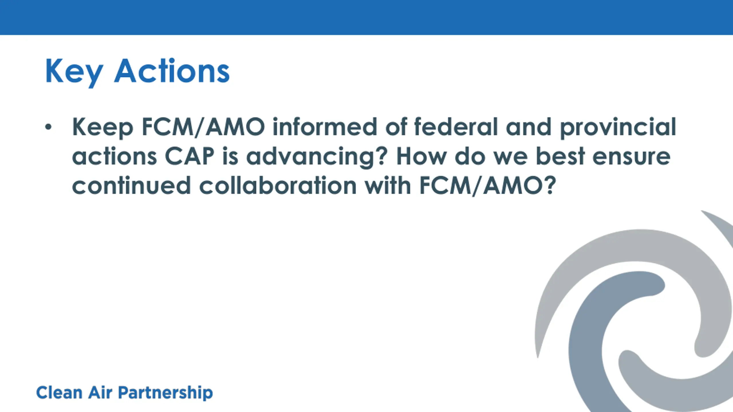 Key Actions Keep FCM/AMO informed of federal and provincial actions CAP is advancing? How do we best ensure continued collaboration with FCM/AMO?