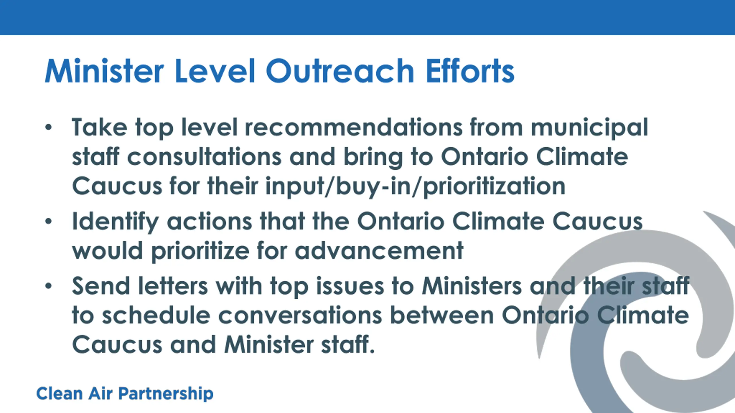 Minister Level Outreach Efforts Take top level recommendations from municipal staff consultations and bring to Ontario Climate Caucus for their input/buy-in/prioritization Identify actions that the Ontario Climate Caucus would prioritize for advancement Send letters with top issues to Ministers and their staff to schedule conversations between Ontario Climate Caucus and Minister staff.