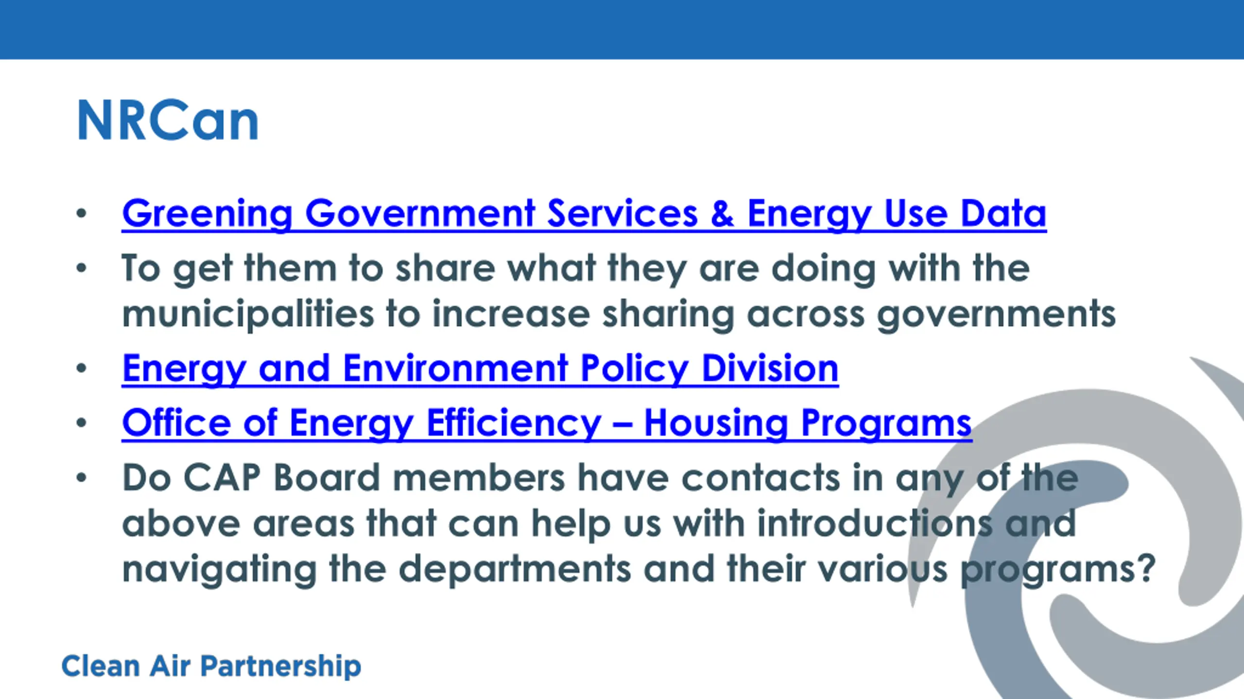 NRCan Greening Government Services & Energy Use Data To get them to share what they are doing with the municipalities to increase sharing across governments Energy and Environment Policy Division Office of Energy Efficiency Housing Programs Do CAP Board members have contacts in any of the above areas that can help us with introductions and navigating the departments and their various programs?