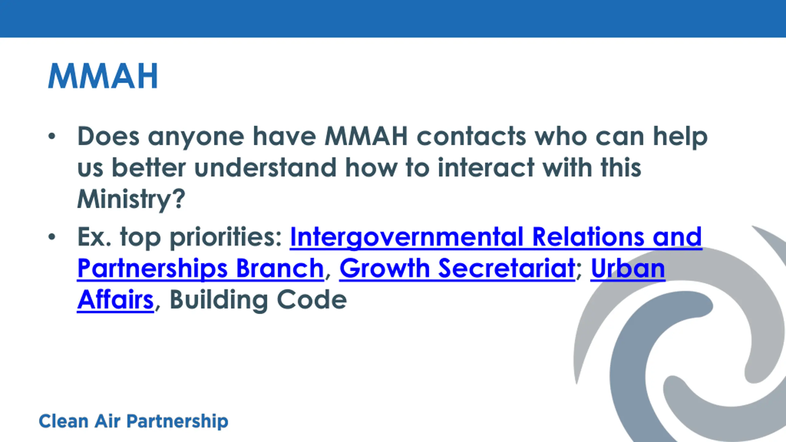 MMAH Does anyone have MMAH contacts who can help us better understand how to interact with this Ministry? Ex. top priorities: Intergovernmental Relations and Partnerships Branch, Growth Secretariat; Urban Affairs, Building Code