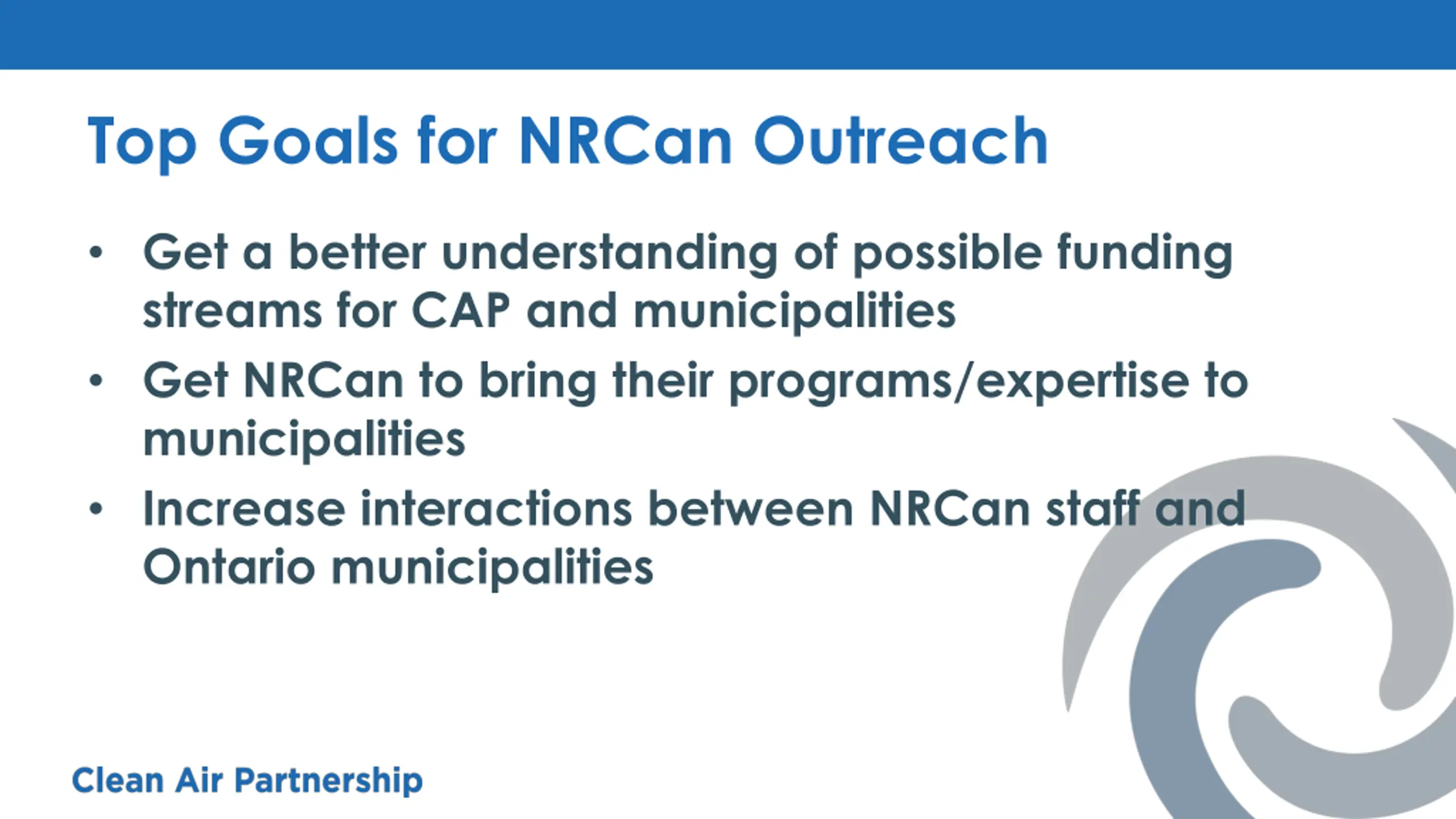 Top Goals for NRCan Outreach Get a better understanding of possible funding streams for CAP and municipalities Get NRCan to bring their programs/expertise to municipalities Increase interactions between NRCan staff and Ontario municipalities