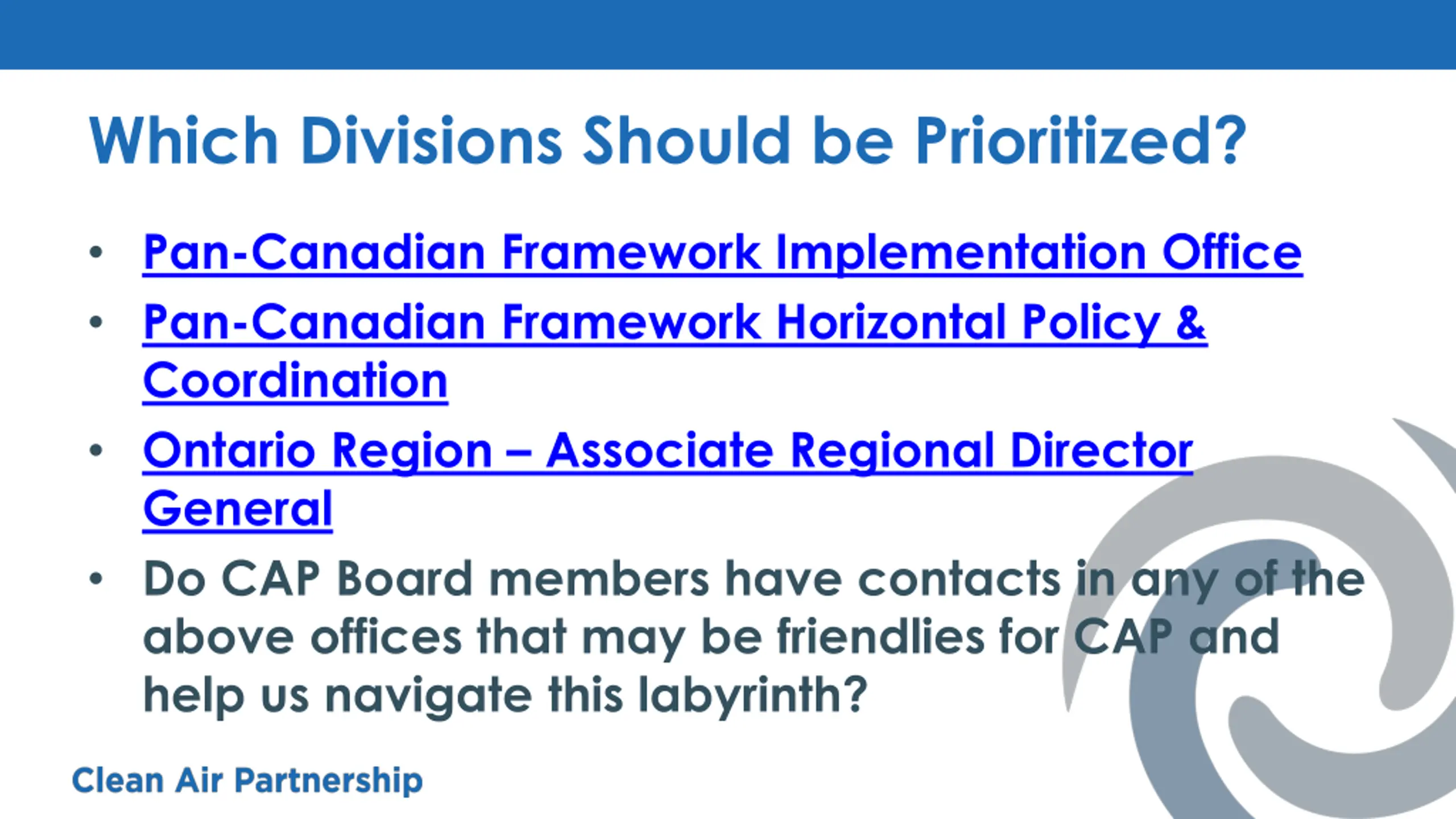 Which Divisions Should be Prioritized? Pan-Canadian Framework Implementation Office Pan-Canadian Framework Horizontal Policy & Coordination Ontario Region Associate Regional Director General Do CAP Board members have contacts in any of the above offices that may be friendlies for CAP and help us navigate this labyrinth?