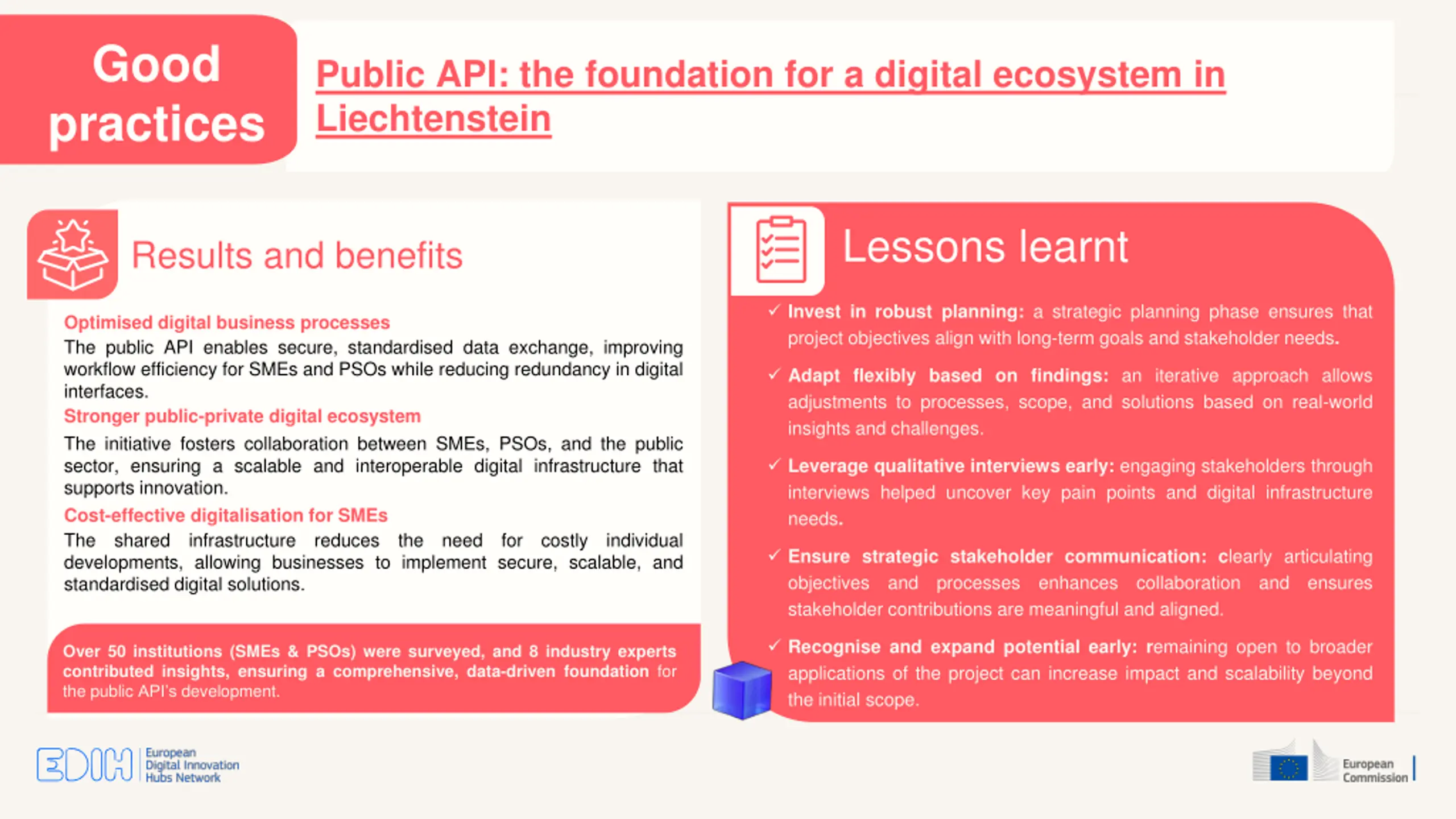 Good practices Public API: the foundation for a digital ecosystem in Liechtenstein Lessons learnt Results and benefits Invest in robust planning: a strategic planning phase ensures that project objectives align with long-term goals and stakeholder needs. Optimised digital business processes The public API enables secure, standardised data exchange, improving workflow efficiency for SMEs and PSOs while reducing redundancy in digital interfaces. Stronger public-private digital ecosystem The initiative fosters collaboration between SMEs, PSOs, and the public sector, ensuring a scalable and interoperable digital infrastructure that supports innovation. Cost-effective digitalisation for SMEs The shared infrastructure reduces developments, allowing businesses to implement secure, scalable, and standardised digital solutions. Adapt flexibly based on findings: an iterative approach allows adjustments to processes, scope, and solutions based on real-world insights and challenges. Leverage qualitative interviews early: engaging stakeholders through interviews helped uncover key pain points and digital infrastructure needs. the need for costly individual Ensure strategic stakeholder communication: clearly articulating objectives and processes enhances stakeholder contributions are meaningful and aligned. collaboration and ensures Recognise and expand potential early: remaining open to broader applications of the project can increase impact and scalability beyond the initial scope. Over 50 institutions (SMEs & PSOs) were surveyed, and 8 industry experts contributed insights, ensuring a comprehensive, data-driven foundation for the public API s development.