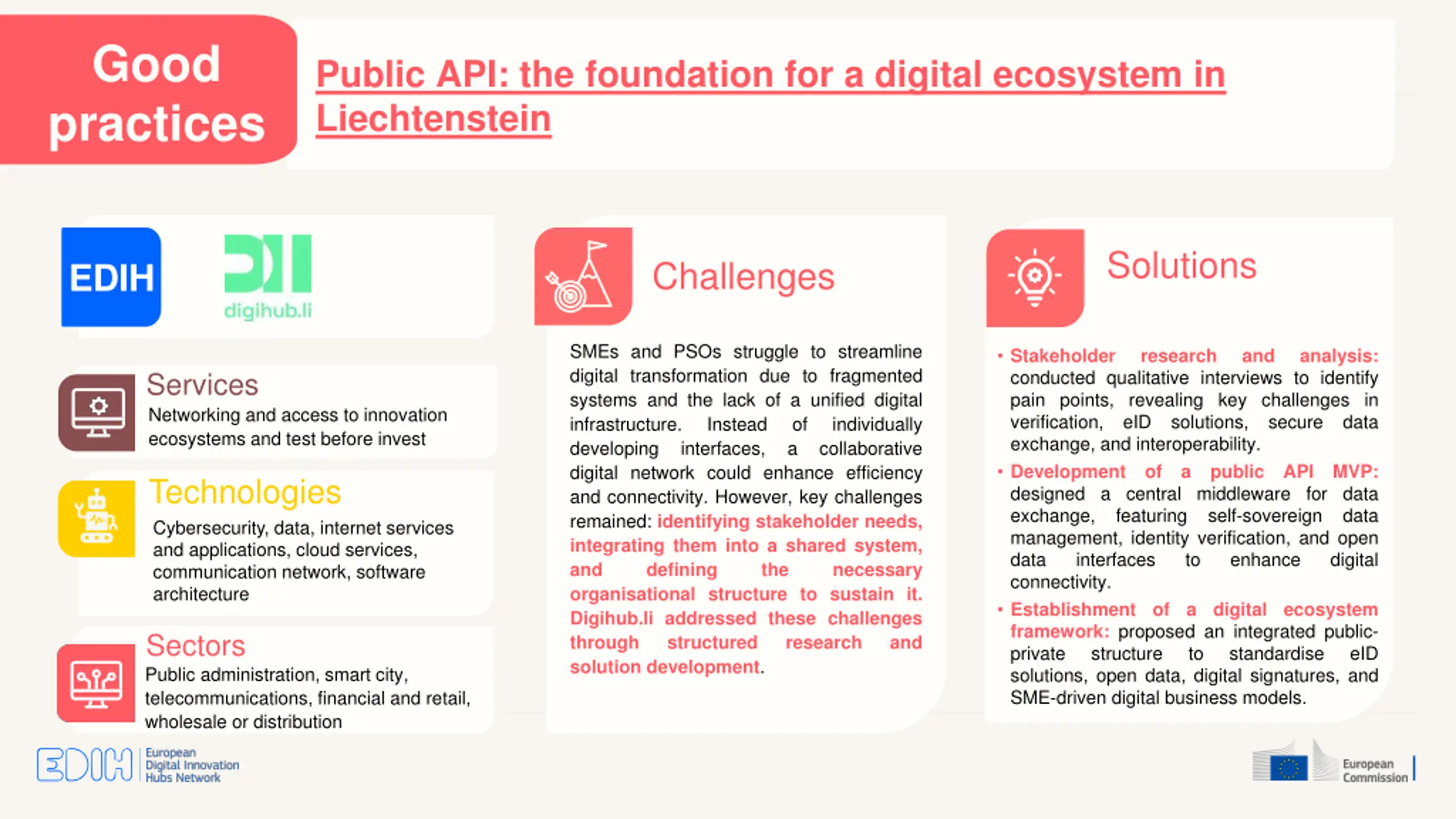 Good practices Public API: the foundation for a digital ecosystem in Liechtenstein Solutions Challenges EDIH SMEs and PSOs struggle to streamline digital transformation due to fragmented systems and the lack of a unified digital infrastructure. Instead developing interfaces, digital network could enhance efficiency and connectivity. However, key challenges remained: identifying stakeholder needs, integrating them into a shared system, and defining organisational structure to sustain it. Digihub.li addressed these challenges through structured solution development. Stakeholder conducted qualitative interviews to identify pain points, revealing key challenges in verification, eID solutions, exchange, and interoperability. Development of a designed a central middleware for data exchange, featuring management, identity verification, and open data interfaces to connectivity. Establishment of a framework: proposed an integrated public- private structure solutions, open data, digital signatures, and SME-driven digital business models. research and analysis: Services Networking and access to innovation ecosystems and test before invest secure data of a individually collaborative public API MVP: Technologies Cybersecurity, data, internet services and applications, cloud services, communication network, software architecture self-sovereign data enhance digital the necessary digital ecosystem Sectors research and to standardise eID Public administration, smart city, telecommunications, financial and retail, wholesale or distribution