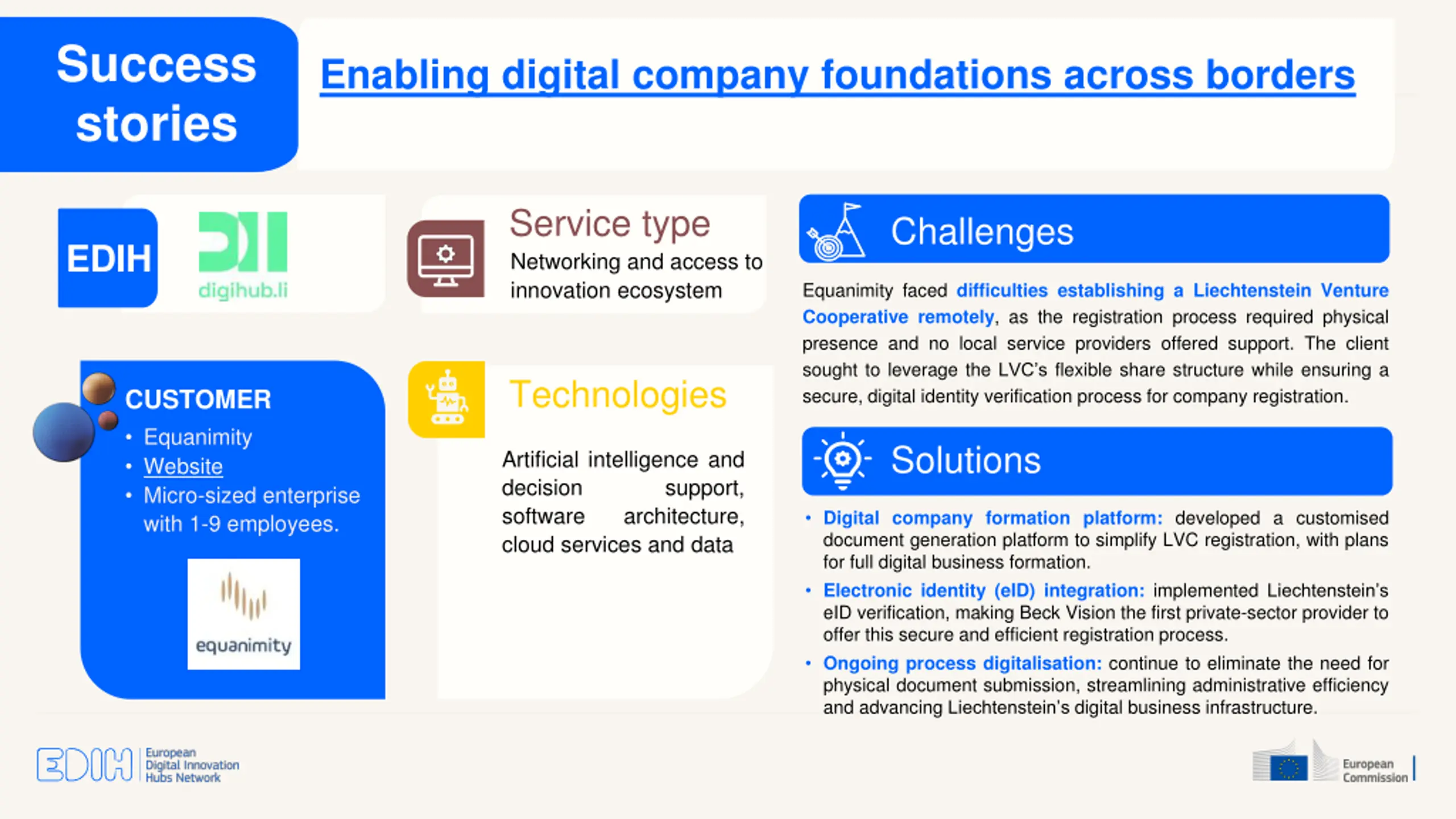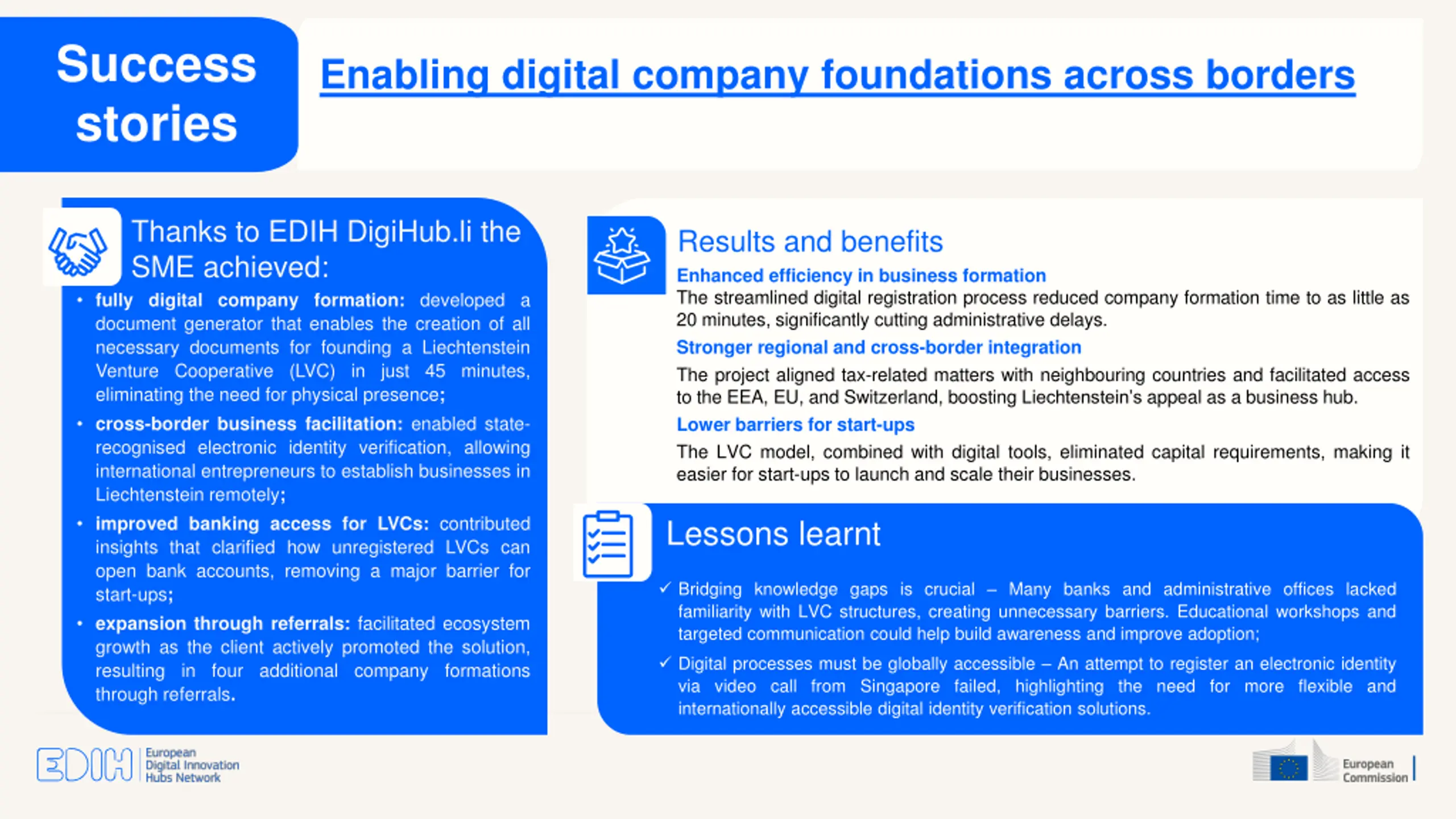 Success stories Enabling digital company foundations across borders Thanks to EDIH DigiHub.li the SME achieved:: fully digital company formation: developed a document generator that enables the creation of all necessary documents for founding a Liechtenstein Venture Cooperative (LVC) in just 45 minutes, eliminating the need for physical presence; cross-border business facilitation: enabled state- recognised electronic identity verification, allowing international entrepreneurs to establish businesses in Liechtenstein remotely; improved banking access for LVCs: contributed insights that clarified how unregistered LVCs can open bank accounts, removing a major barrier for start-ups; expansion through referrals: facilitated ecosystem growth as the client actively promoted the solution, resulting in four additional company formations through referrals. Results and benefits Enhanced efficiency in business formation The streamlined digital registration process reduced company formation time to as little as 20 minutes, significantly cutting administrative delays. Stronger regional and cross-border integration The project aligned tax-related matters with neighbouring countries and facilitated access to the EEA, EU, and Switzerland, boosting Liechtenstein s appeal as a business hub. Lower barriers for start-ups The LVC model, combined with digital tools, eliminated capital requirements, making it easier for start-ups to launch and scale their businesses. Lessons learnt Bridging knowledge gaps is crucial Many banks and administrative offices lacked familiarity with LVC structures, creating unnecessary barriers. Educational workshops and targeted communication could help build awareness and improve adoption; Digital processes must be globally accessible An attempt to register an electronic identity via video call from Singapore failed, highlighting the need for more flexible and internationally accessible digital identity verification solutions.
