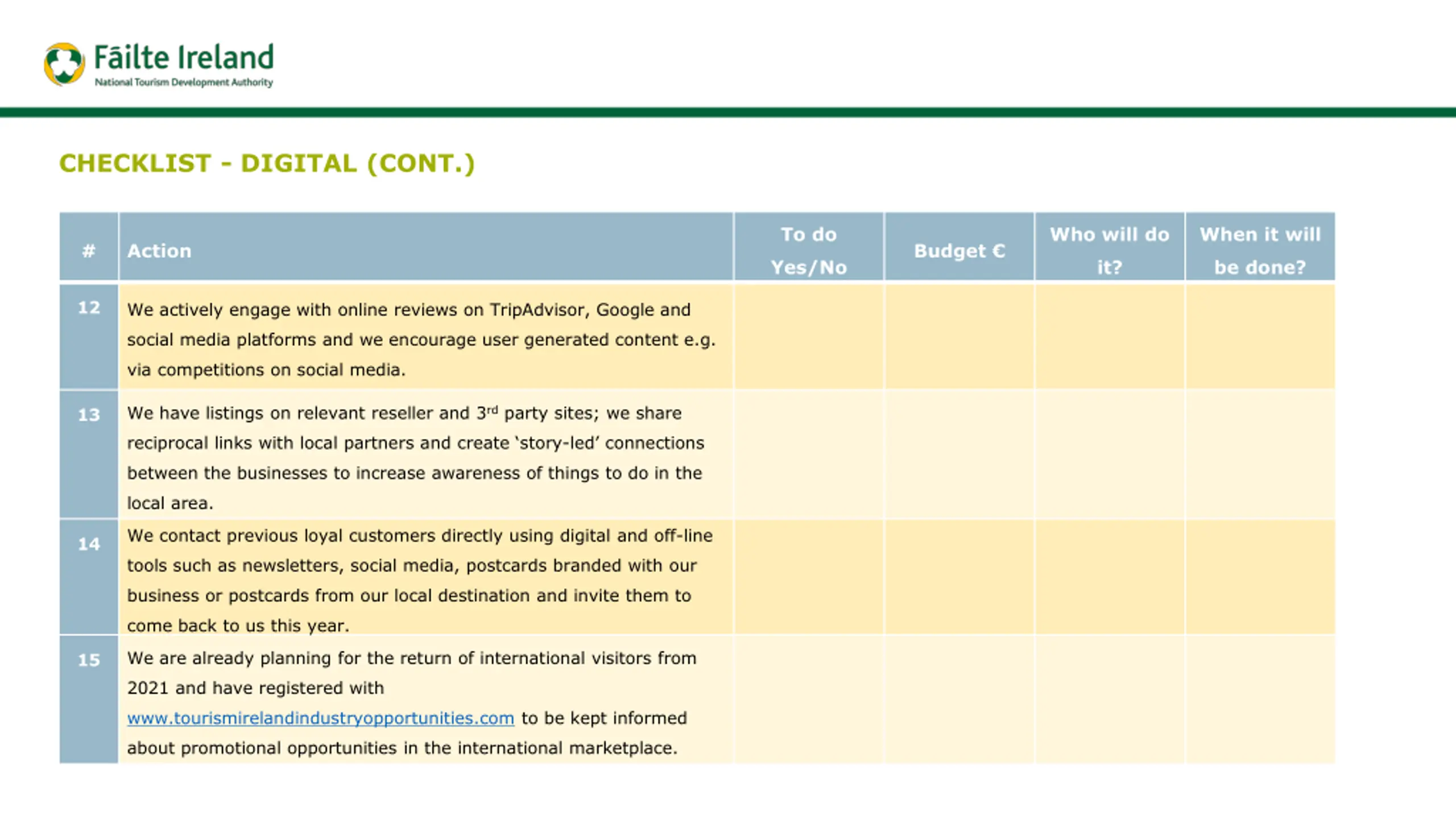 CHECKLIST - DIGITAL (CONT.) To do Who will do When it will # Action Budget Yes/No it? be done? 12 We actively engage with online reviews on TripAdvisor, Google and social media platforms and we encourage user generated content e.g. via competitions on social media. We have listings on relevant reseller and 3rd party sites; we share 13 reciprocal links with local partners and create story-led connections between the businesses to increase awareness of things to do in the local area. We contact previous loyal customers directly using digital and off-line 14 tools such as newsletters, social media, postcards branded with our business or postcards from our local destination and invite them to come back to us this year. We are already planning for the return of international visitors from 15 2021 and have registered with www.tourismirelandindustryopportunities.com to be kept informed about promotional opportunities in the international marketplace.