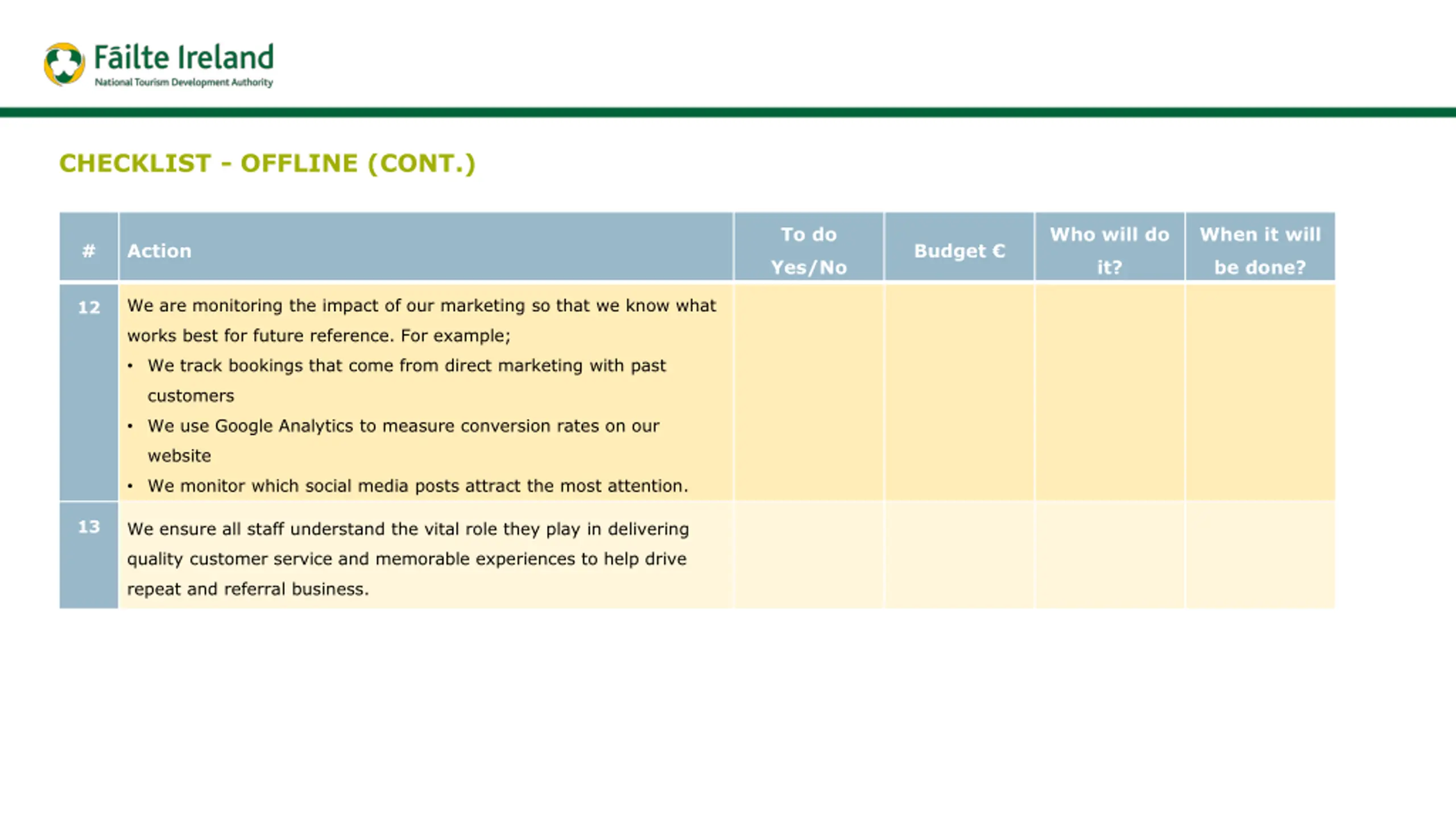 CHECKLIST - OFFLINE (CONT.) To do Who will do When it will # Action Budget Yes/No it? be done? We are monitoring the impact of our marketing so that we know what 12 works best for future reference. For example; We track bookings that come from direct marketing with past customers We use Google Analytics to measure conversion rates on our website We monitor which social media posts attract the most attention. 13 We ensure all staff understand the vital role they play in delivering quality customer service and memorable experiences to help drive repeat and referral business.