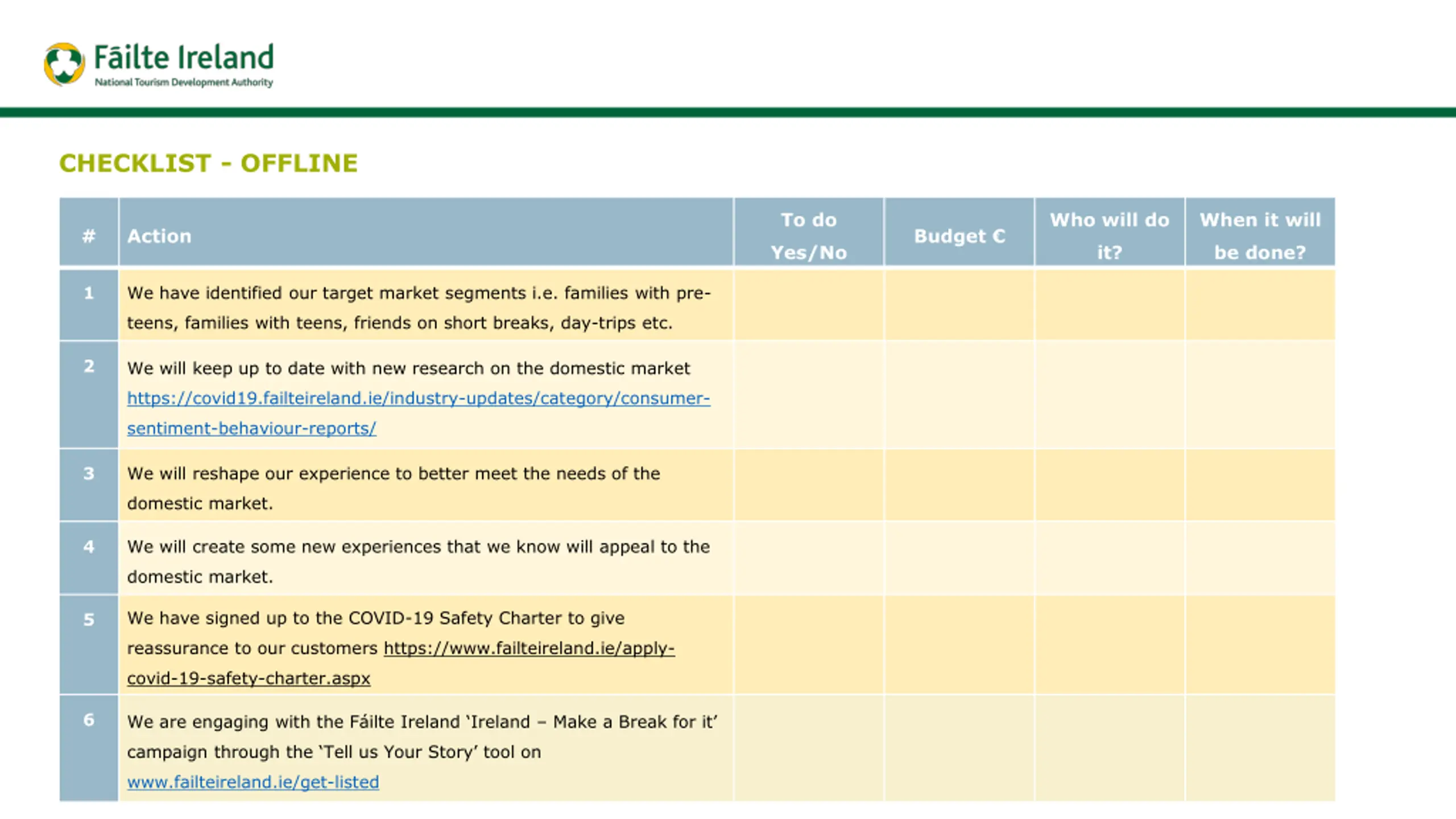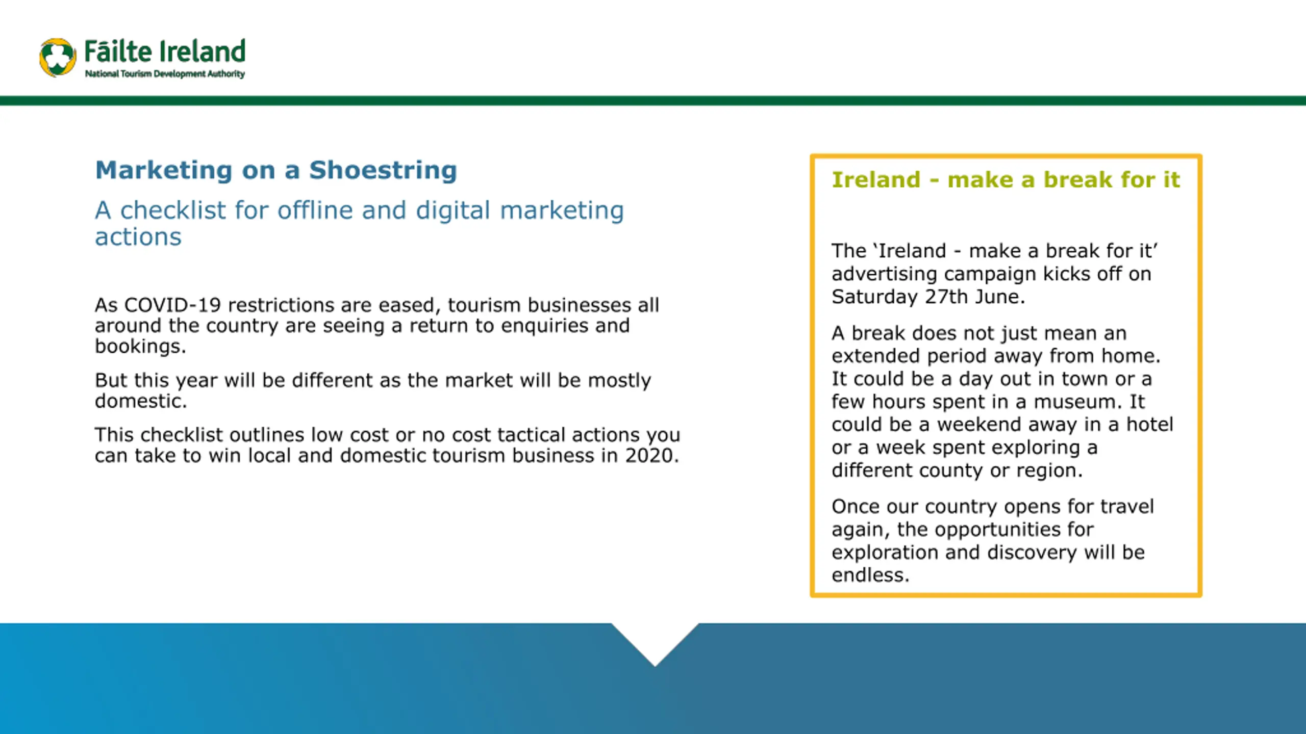 Marketing on a Shoestring A checklist for offline and digital marketing actions Ireland - make a break for it The Ireland - make a break for it advertising campaign kicks off on Saturday 27th June. As COVID-19 restrictions are eased, tourism businesses all around the country are seeing a return to enquiries and bookings. A break does not just mean an extended period away from home. It could be a day out in town or a few hours spent in a museum. It could be a weekend away in a hotel or a week spent exploring a different county or region. But this year will be different as the market will be mostly domestic. This checklist outlines low cost or no cost tactical actions you can take to win local and domestic tourism business in 2020. Once our country opens for travel again, the opportunities for exploration and discovery will be endless.