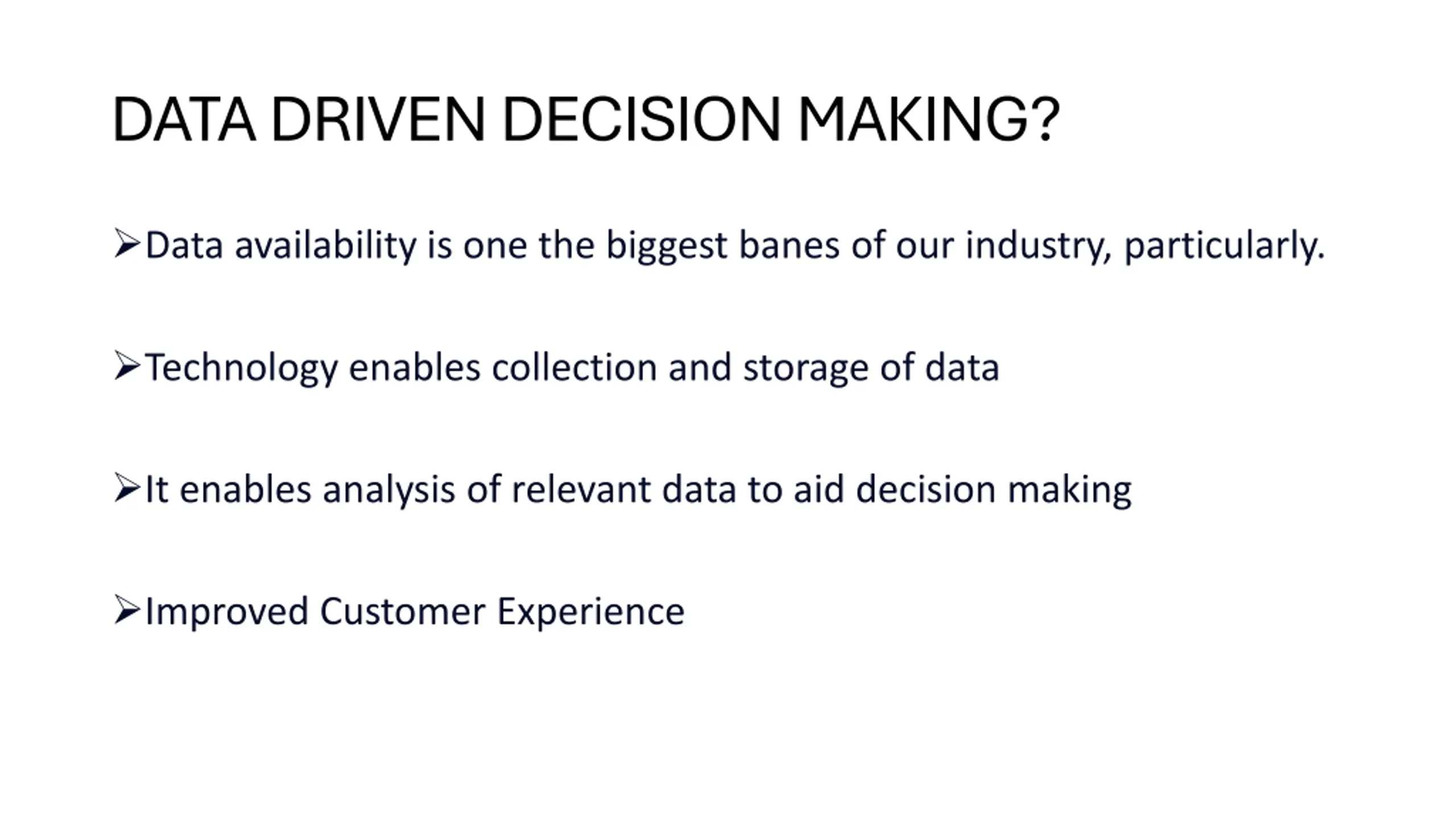 DATA DRIVEN DECISION MAKING? Data availability is one the biggest banes of our industry, particularly. Technology enables collection and storage of data It enables analysis of relevant data to aid decision making Improved Customer Experience