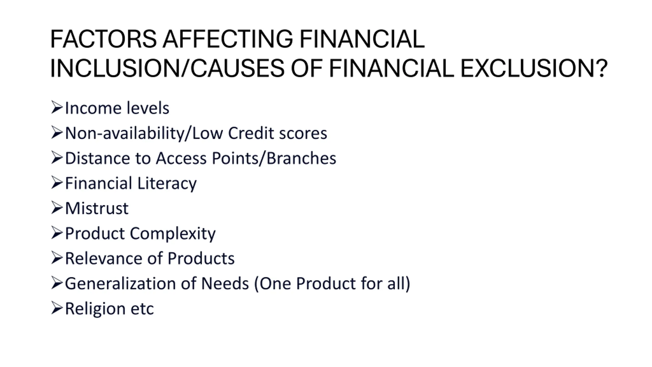 FACTORS AFFECTING FINANCIAL INCLUSION/CAUSES OF FINANCIAL EXCLUSION? Income levels Non-availability/Low Credit scores Distance to Access Points/Branches Financial Literacy Mistrust Product Complexity Relevance of Products Generalization of Needs (One Product for all) Religion etc
