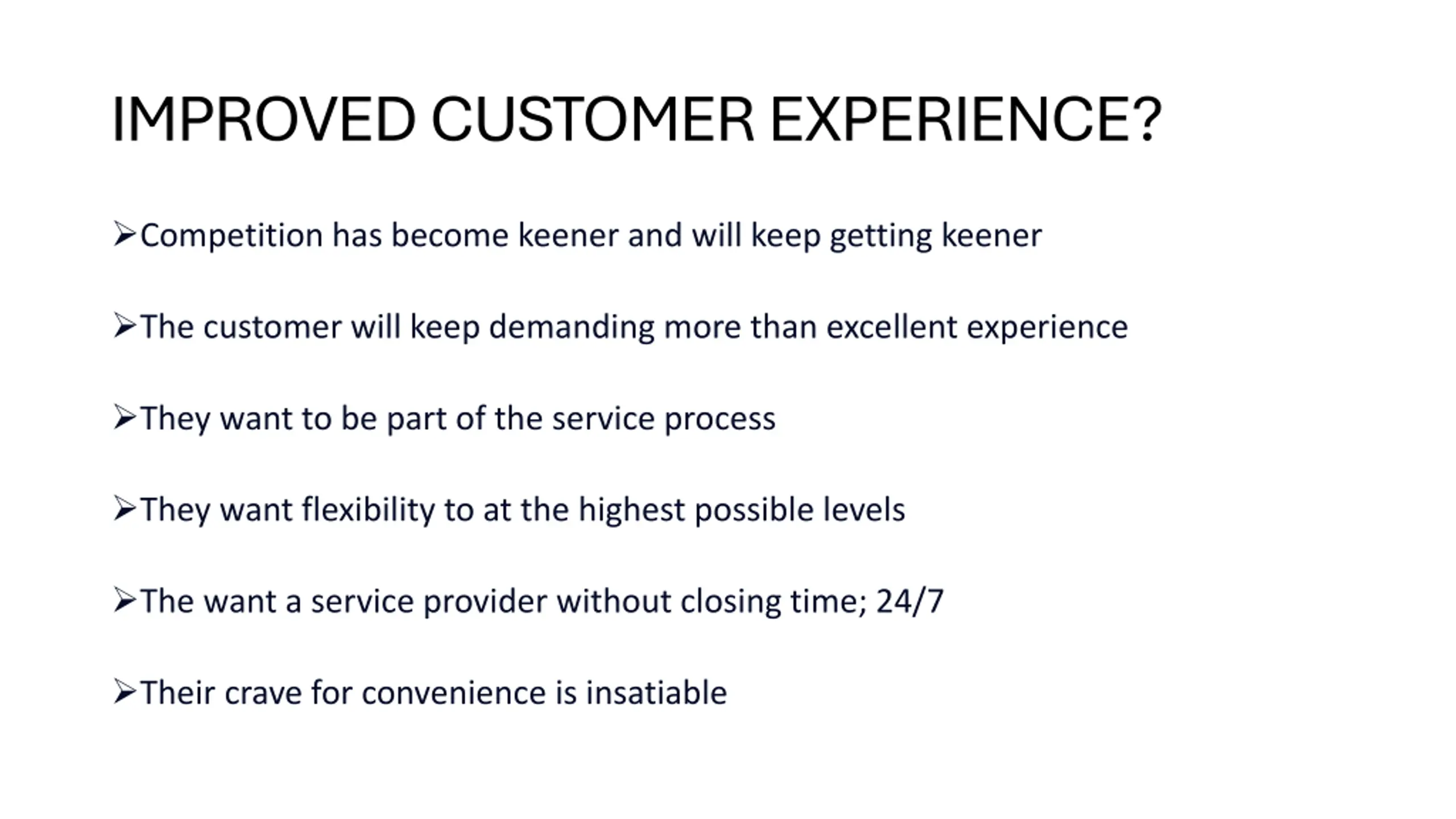 IMPROVED CUSTOMER EXPERIENCE? Competition has become keener and will keep getting keener The customer will keep demanding more than excellent experience They want to be part of the service process They want flexibility to at the highest possible levels The want a service provider without closing time; 24/7 Their crave for convenience is insatiable