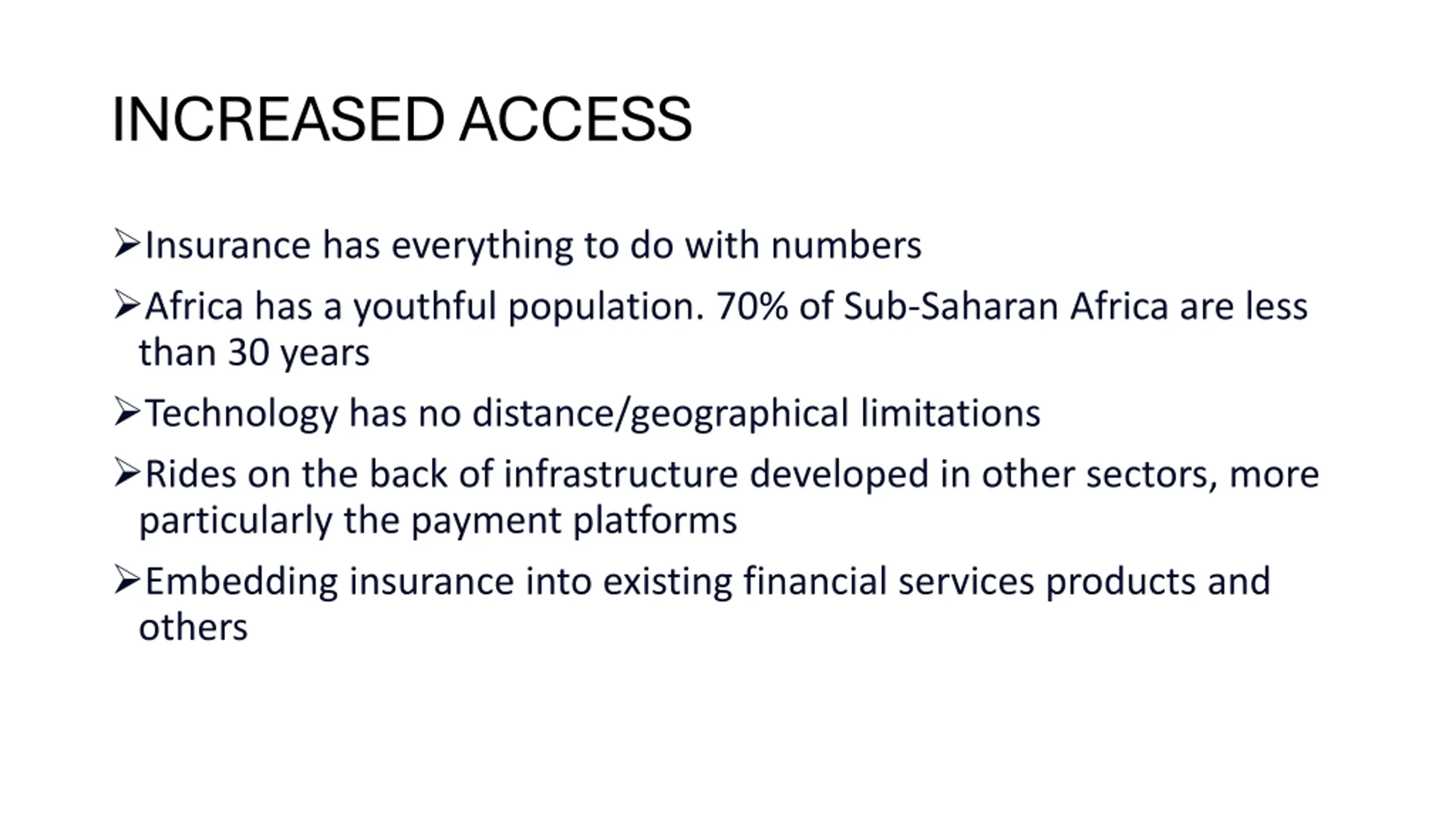 INCREASED ACCESS Insurance has everything to do with numbers Africa has a youthful population. 70% of Sub-Saharan Africa are less than 30 years Technology has no distance/geographical limitations Rides on the back of infrastructure developed in other sectors, more particularly the payment platforms Embedding insurance into existing financial services products and others