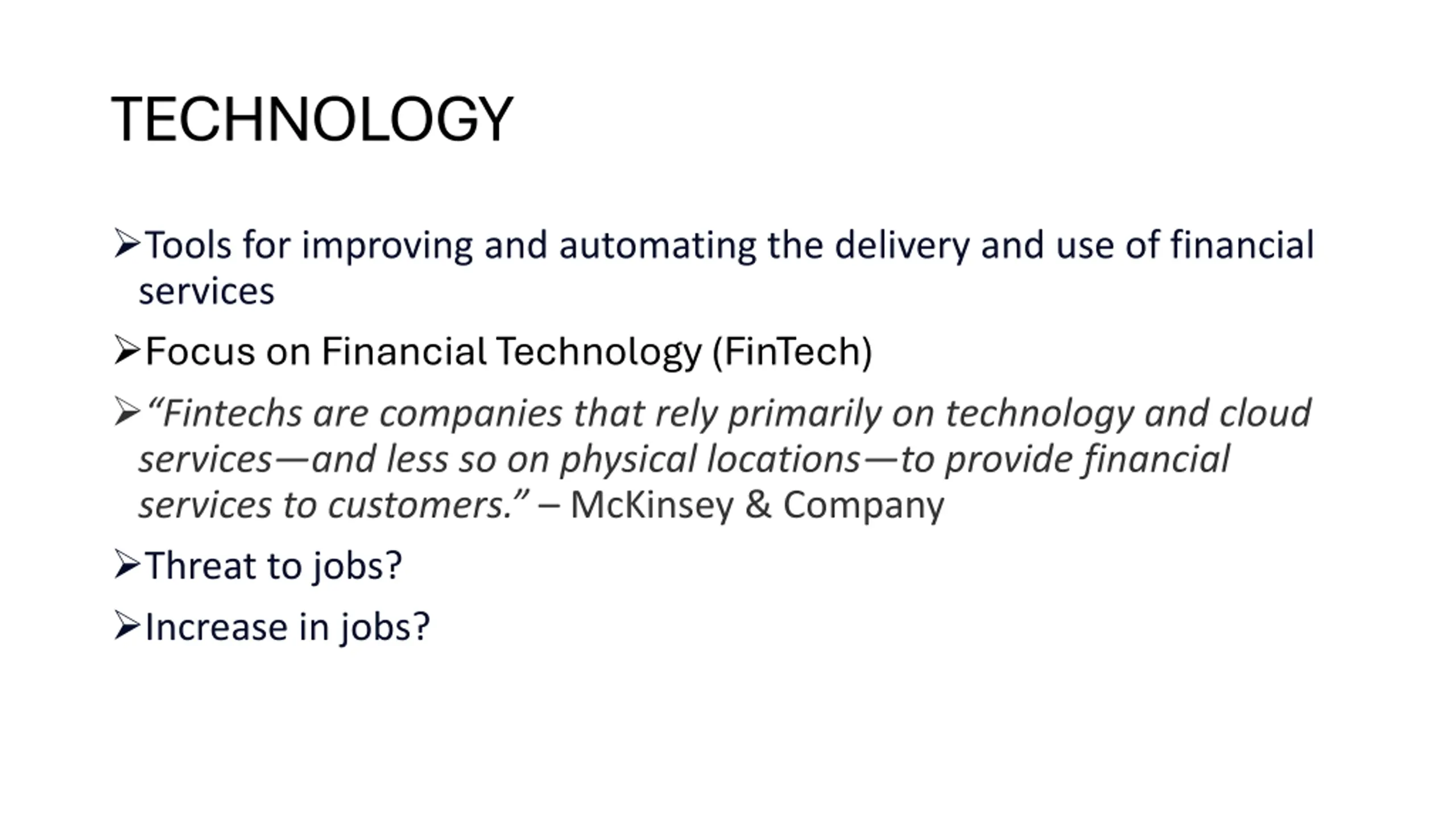 TECHNOLOGY Tools for improving and automating the delivery and use of financial services Focus on Financial Technology (FinTech) Fintechs are companies that rely primarily on technology and cloud services and less so on physical locations to provide financial services to customers. McKinsey & Company Threat to jobs? Increase in jobs?