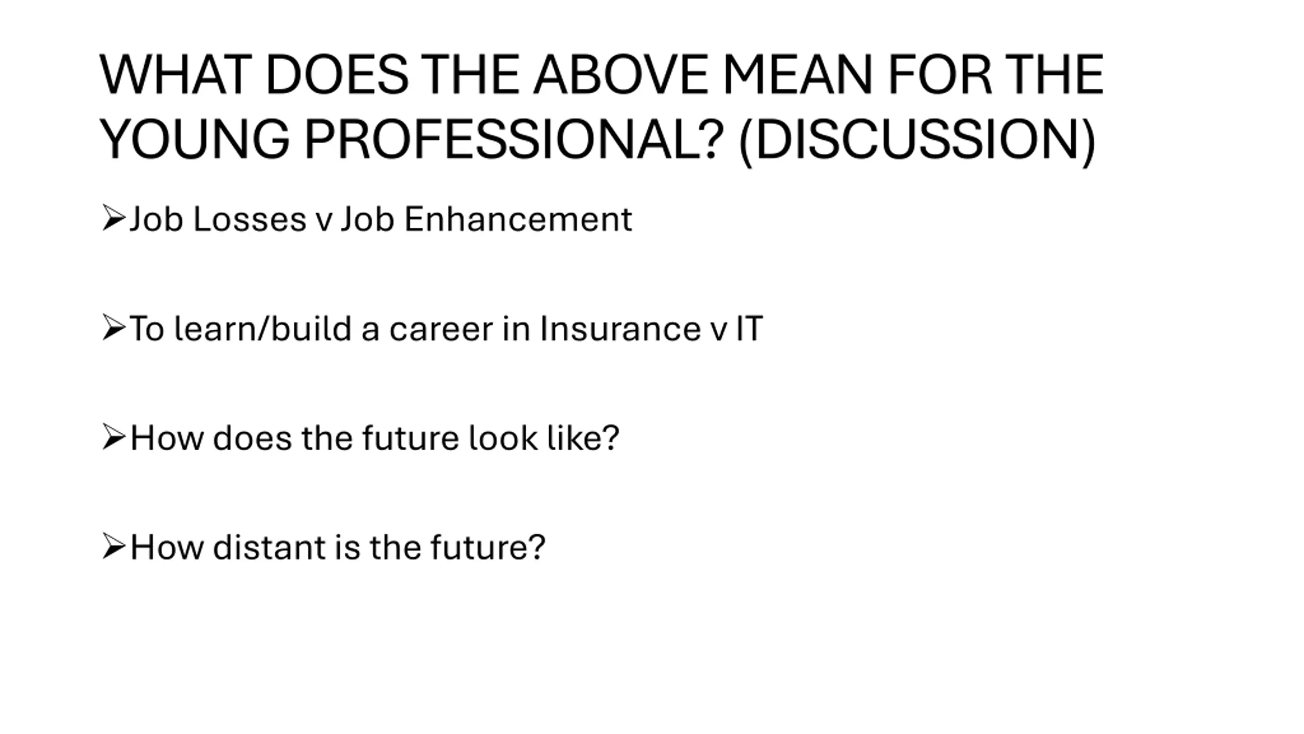WHAT DOES THE ABOVE MEAN FOR THE YOUNG PROFESSIONAL? (DISCUSSION) Job Losses v Job Enhancement To learn/build a career in Insurance v IT How does the future look like? How distant is the future?