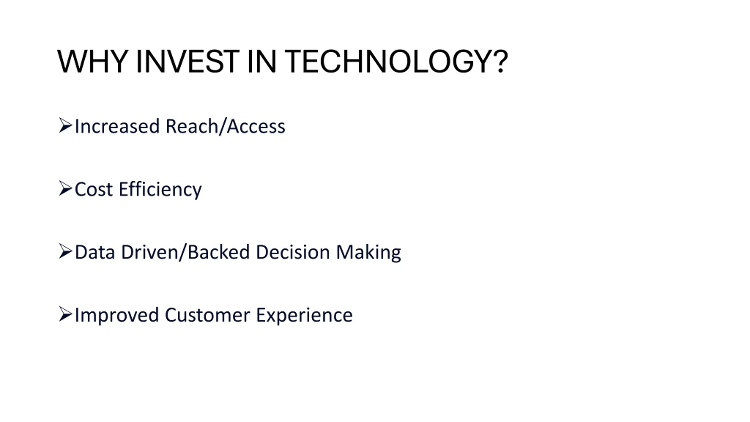 WHY INVEST IN TECHNOLOGY? Increased Reach/Access Cost Efficiency Data Driven/Backed Decision Making Improved Customer Experience