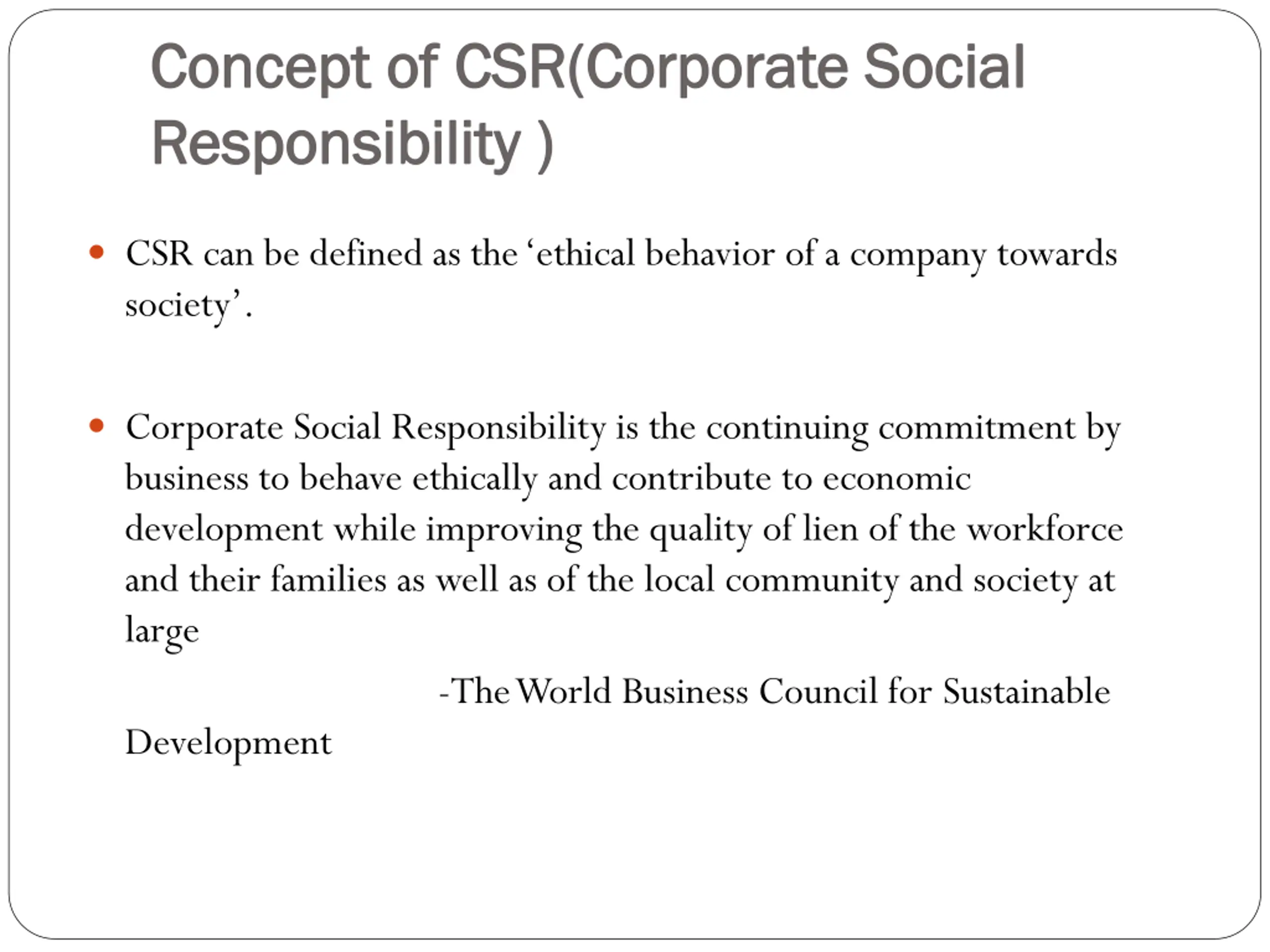 Concept of Concept of CSR( Responsibility Responsibility ) ) CSR(Corporate Social Corporate Social CSR can be defined as the ethical behavior of a company towards society . Corporate Social Responsibility is the continuing commitment by business to behave ethically and contribute to economic development while improving the quality of lien of the workforce and their families as well as of the local community and society at large -The World Business Council for Sustainable Development