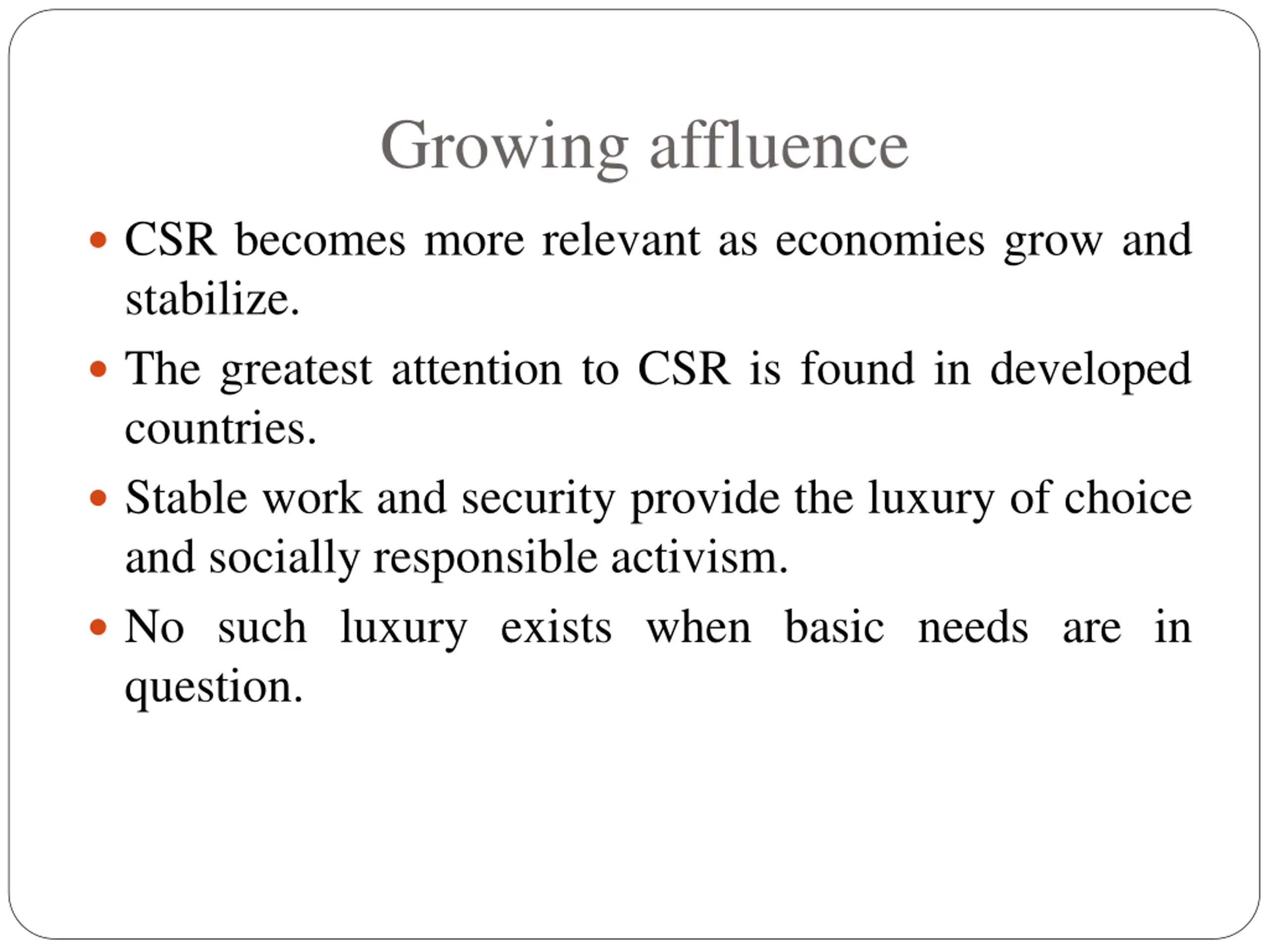 Growing affluence CSR becomes more relevant as economies grow and stabilize. The greatest attention to CSR is found in developed countries. Stable work and security provide the luxury of choice and socially responsible activism. No such luxury exists when basic needs are in question.