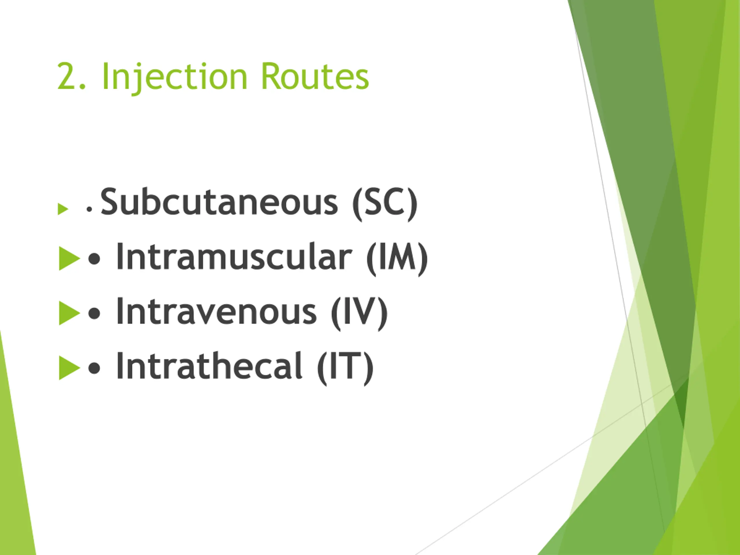 2. Injection Routes Subcutaneous (SC) Intramuscular (IM) Intravenous (IV) Intrathecal (IT)