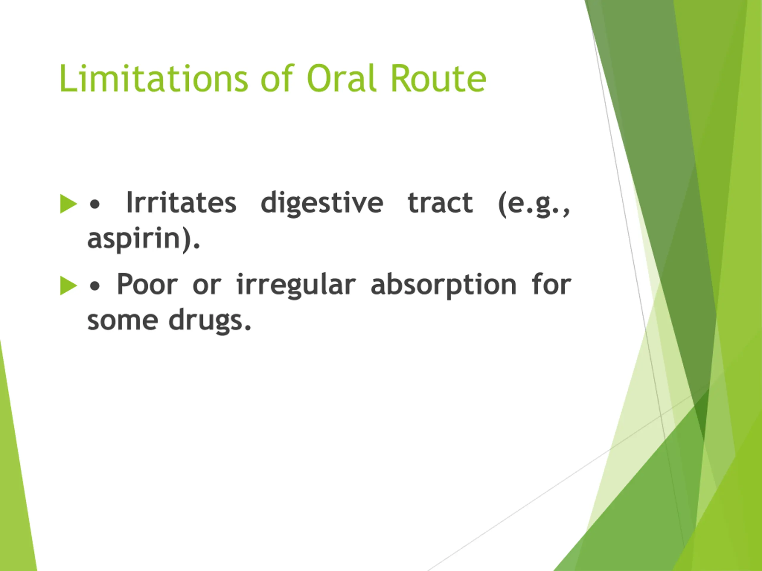 Limitations of Oral Route Irritates digestive tract (e.g., aspirin). Poor or irregular absorption for some drugs.