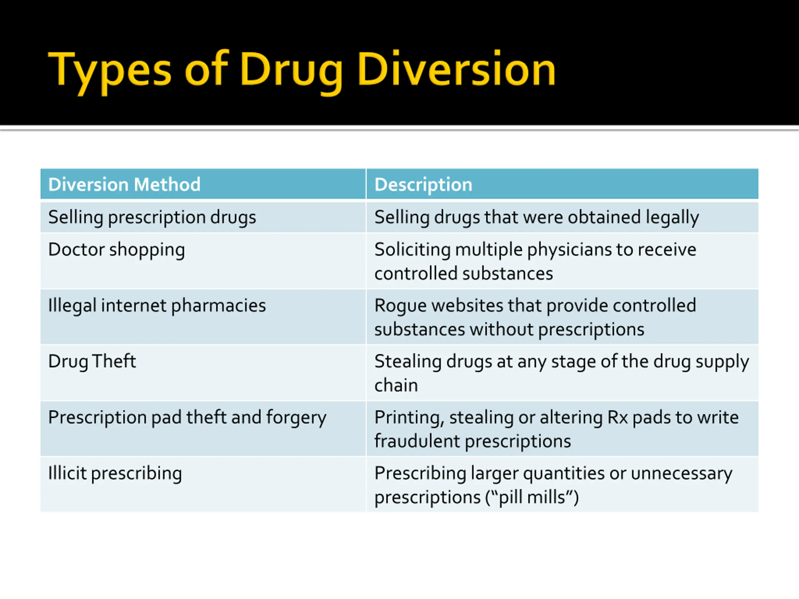 Diversion Method Description Selling prescription drugs Selling drugs that were obtained legally Doctor shopping Soliciting multiple physicians to receive controlled substances Illegal internet pharmacies Rogue websites that provide controlled substances without prescriptions Drug Theft Stealing drugs at any stage of the drug supply chain Prescription pad theft and forgery Printing, stealing or altering Rx pads to write fraudulent prescriptions Illicit prescribing Prescribing larger quantities or unnecessary prescriptions ( pill mills )