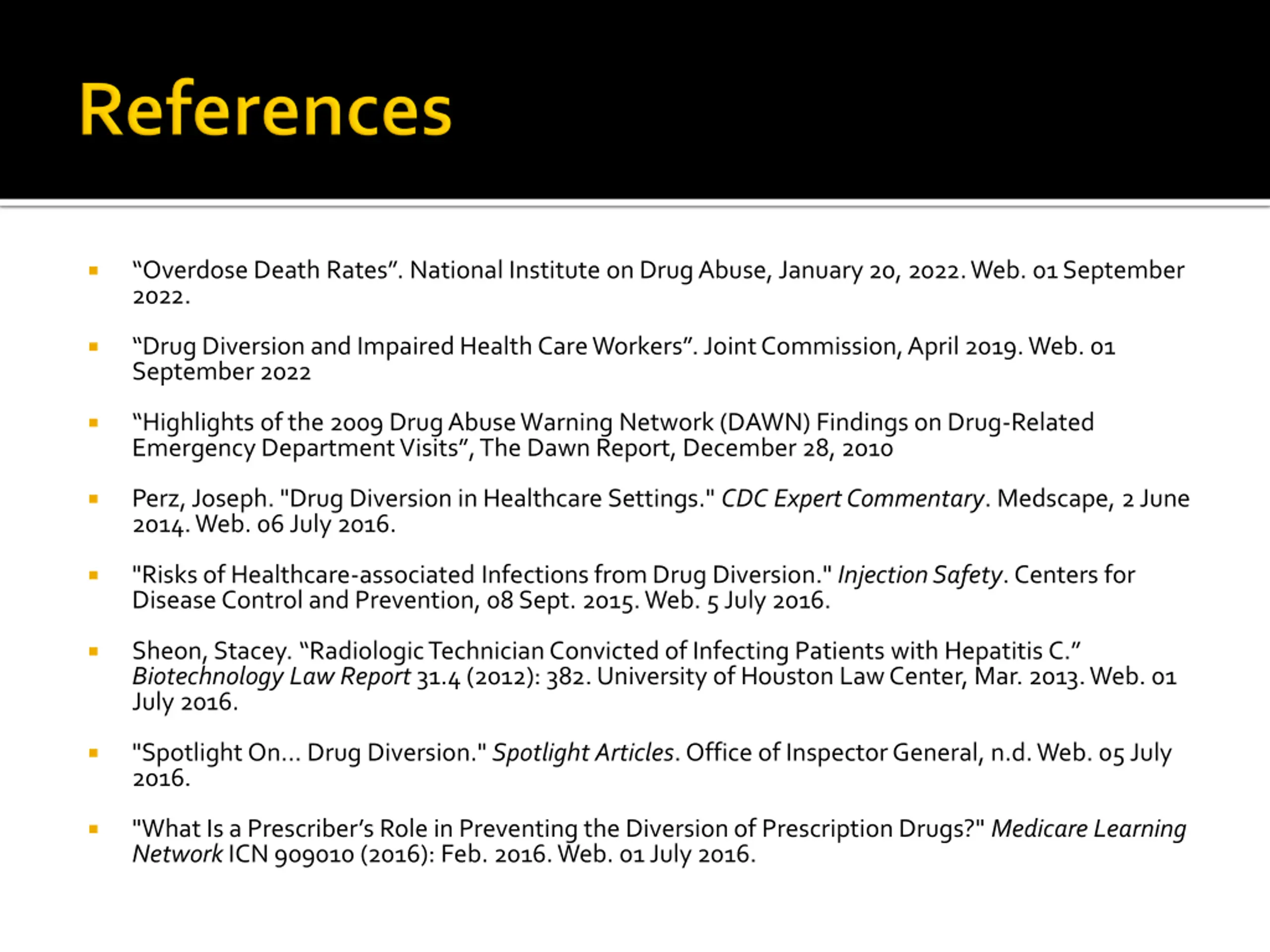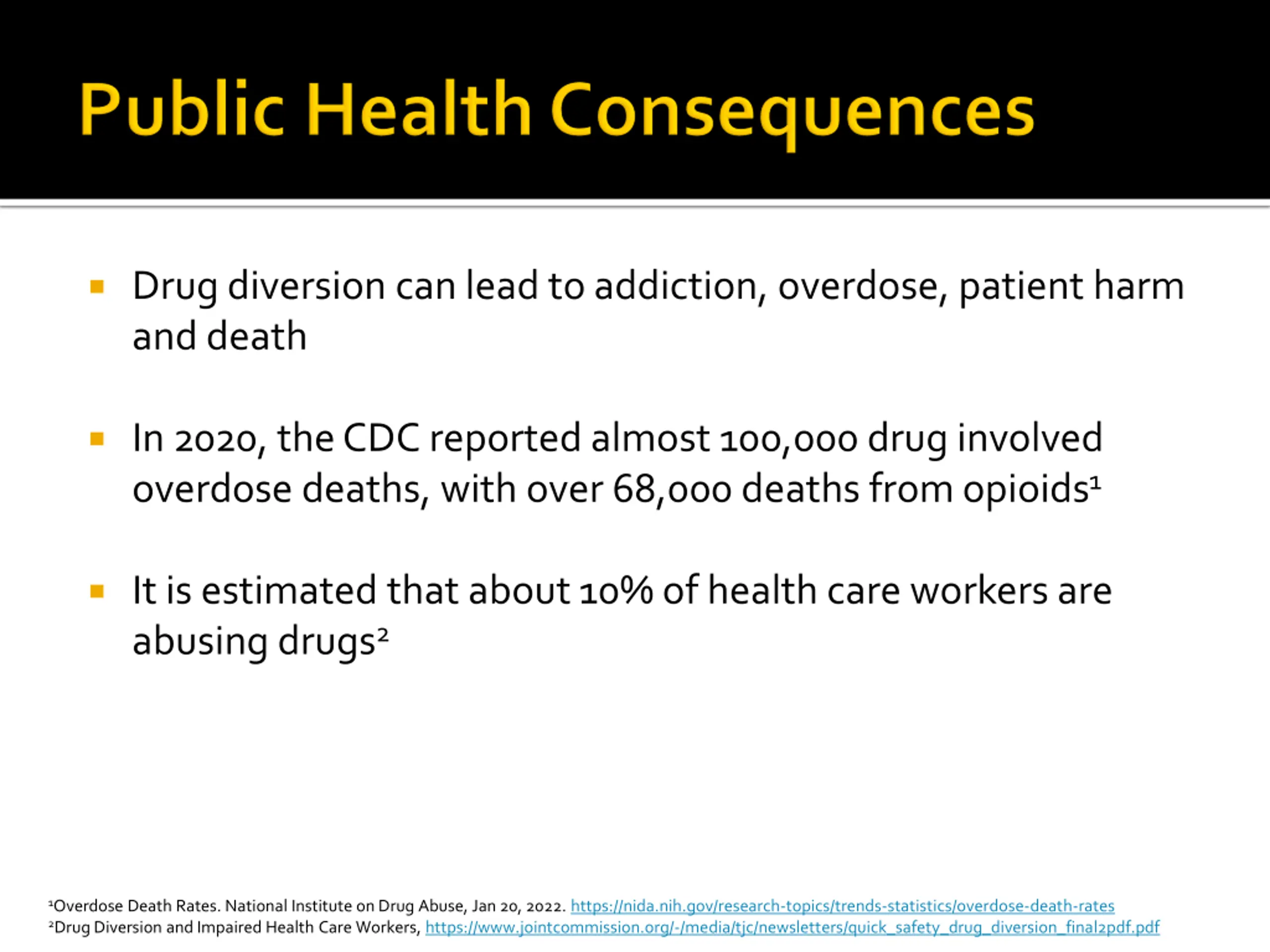 Overdose Death Rates. National Institute on Drug Abuse, January 20, 2022. Web. 01 September 2022. Drug Diversion and Impaired Health Care Workers . Joint Commission, April 2019. Web. 01 September 2022 Highlights of the 2009 Drug Abuse Warning Network (DAWN) Findings on Drug-Related Emergency Department Visits , The Dawn Report, December 28, 2010 Perz, Joseph. "Drug Diversion in Healthcare Settings." CDC Expert Commentary. Medscape, 2 June 2014. Web. 06 July 2016. "Risks of Healthcare-associated Infections from Drug Diversion." Injection Safety. Centers for Disease Control and Prevention, 08 Sept. 2015. Web. 5 July 2016. Sheon, Stacey. Radiologic Technician Convicted of Infecting Patients with Hepatitis C. Biotechnology Law Report 31.4 (2012): 382. University of Houston Law Center, Mar. 2013. Web. 01 July 2016. "Spotlight On... Drug Diversion." Spotlight Articles. Office of Inspector General, n.d. Web. 05 July 2016. "What Is a Prescriber s Role in Preventing the Diversion of Prescription Drugs?" Medicare Learning NetworkICN 909010 (2016): Feb. 2016. Web. 01 July 2016.