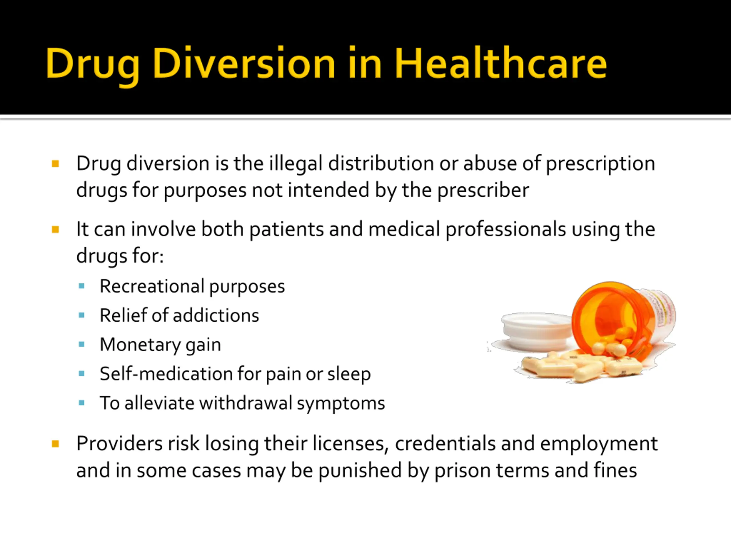 Drug diversion is the illegal distribution or abuse of prescription drugs for purposes not intended by the prescriber It can involve both patients and medical professionals using the drugs for: Recreational purposes Relief of addictions Monetary gain Self-medication for pain or sleep To alleviate withdrawal symptoms Providers risk losing their licenses, credentials and employment and in some cases may be punished by prison terms and fines