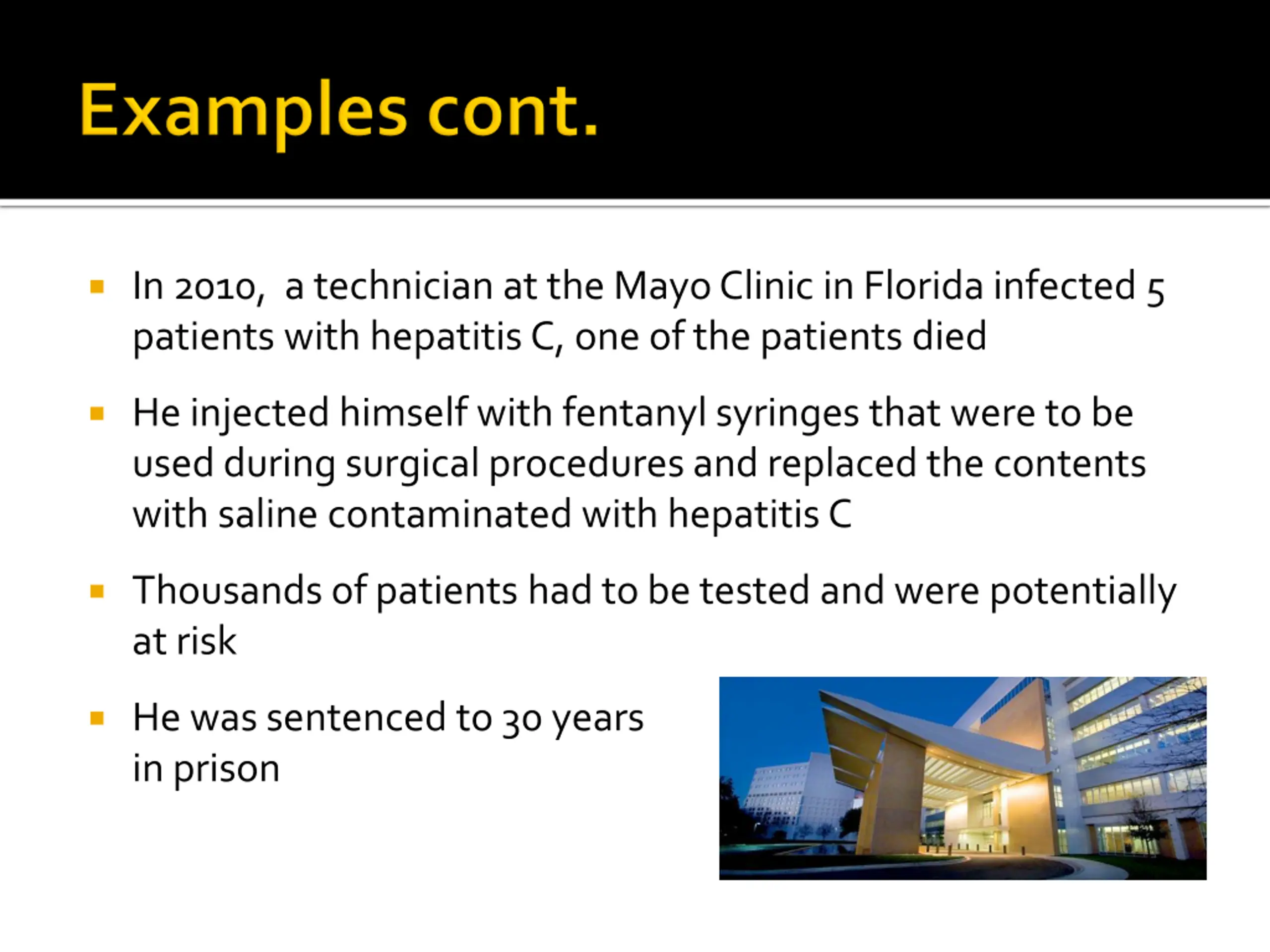 In 2010, a technician at the Mayo Clinic in Florida infected 5 patients with hepatitis C, one of the patients died He injected himself with fentanyl syringes that were to be used during surgical procedures and replaced the contents with saline contaminated with hepatitis C Thousands of patients had to be tested and were potentially at risk He was sentenced to 30 years in prison