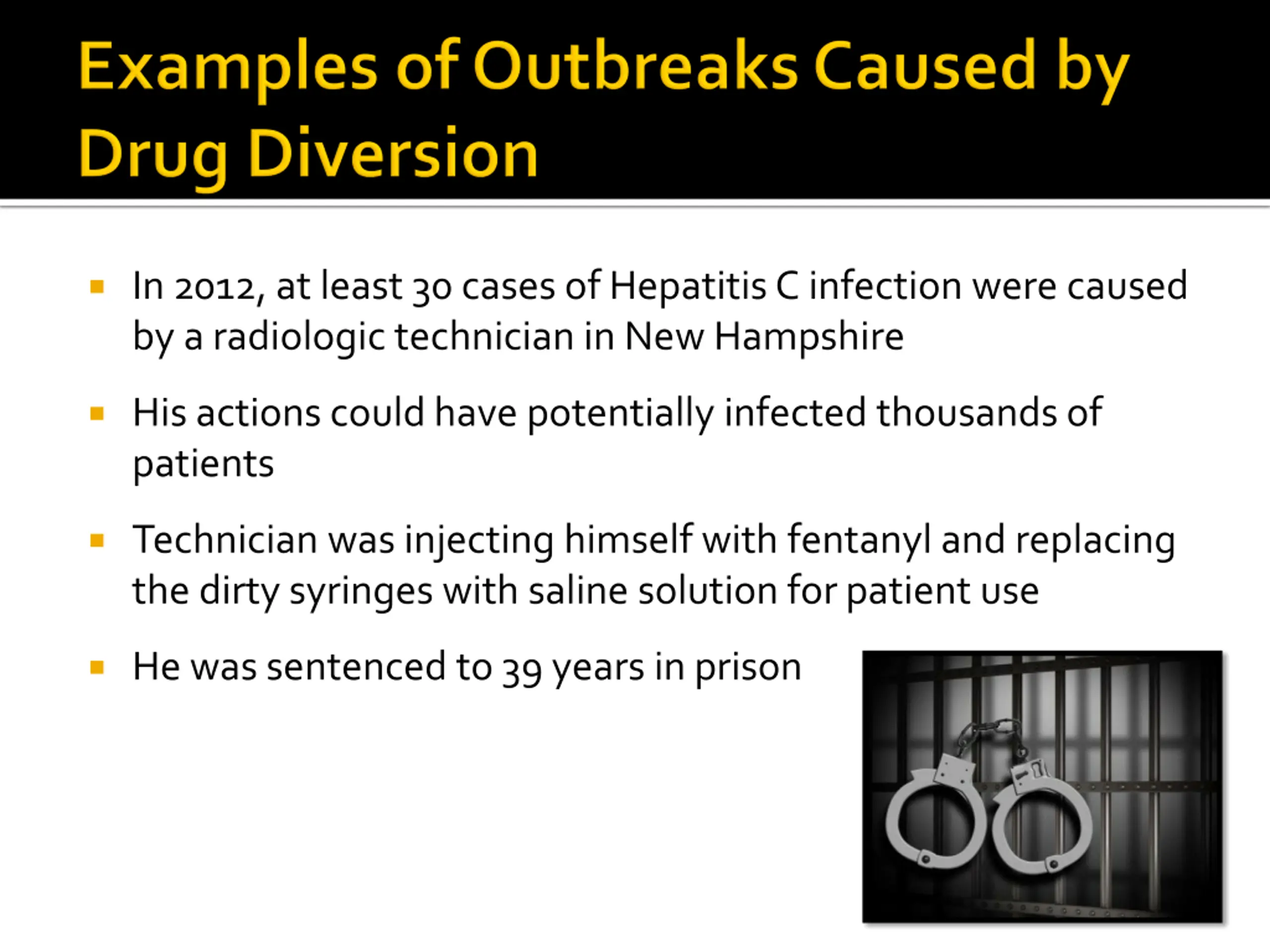 In 2012, at least 30 cases of Hepatitis C infection were caused by a radiologic technician in New Hampshire His actions could have potentially infected thousands of patients Technician was injecting himself with fentanyl and replacing the dirty syringes with saline solution for patient use He was sentenced to 39 years in prison