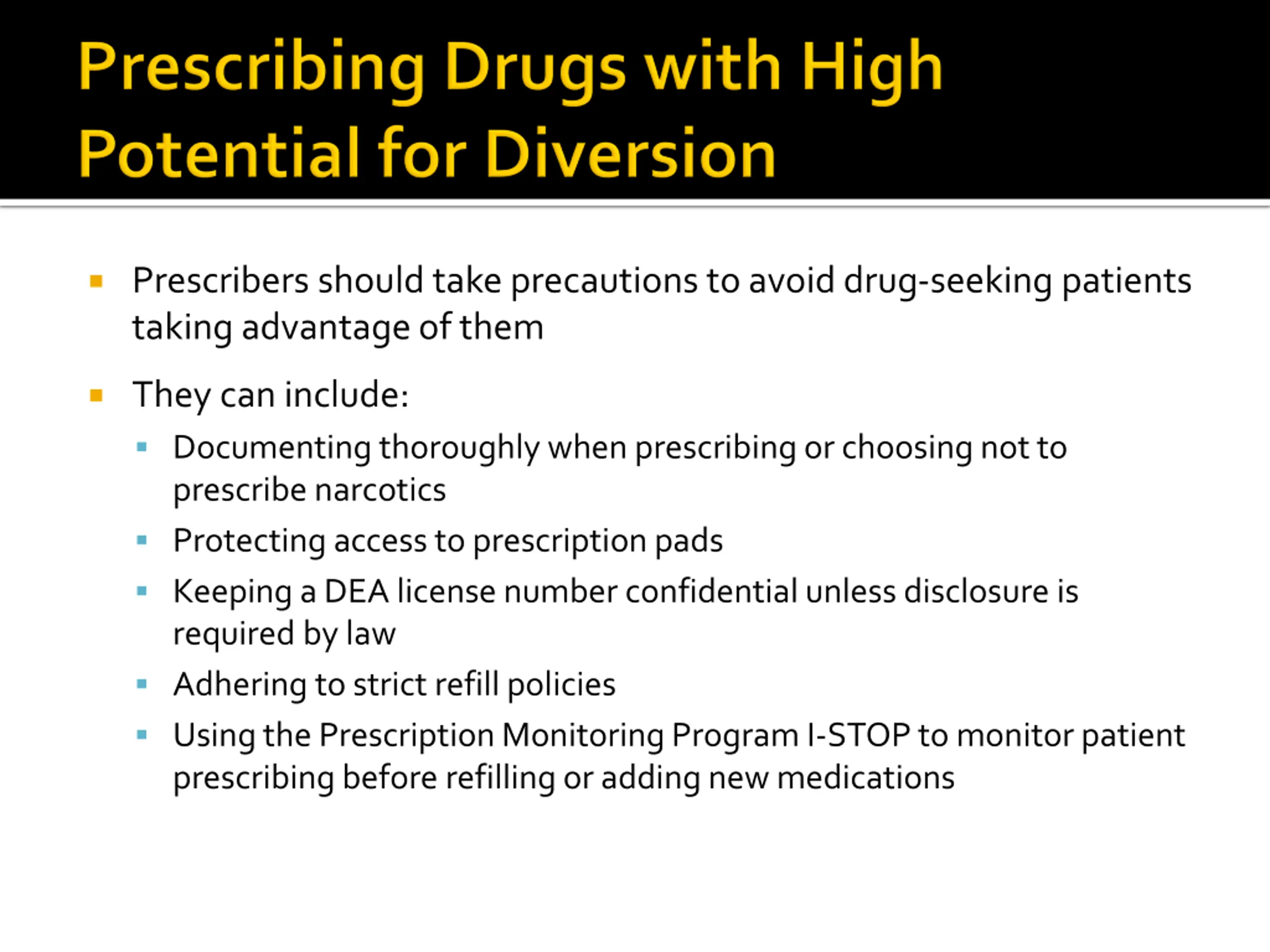 Prescribers should take precautions to avoid drug-seeking patients taking advantage of them They can include: Documenting thoroughly when prescribing or choosing not to prescribe narcotics Protecting access to prescription pads Keeping a DEA license number confidential unless disclosure is required by law Adhering to strict refill policies Using the Prescription Monitoring Program I-STOP to monitor patient prescribing before refilling or adding new medications