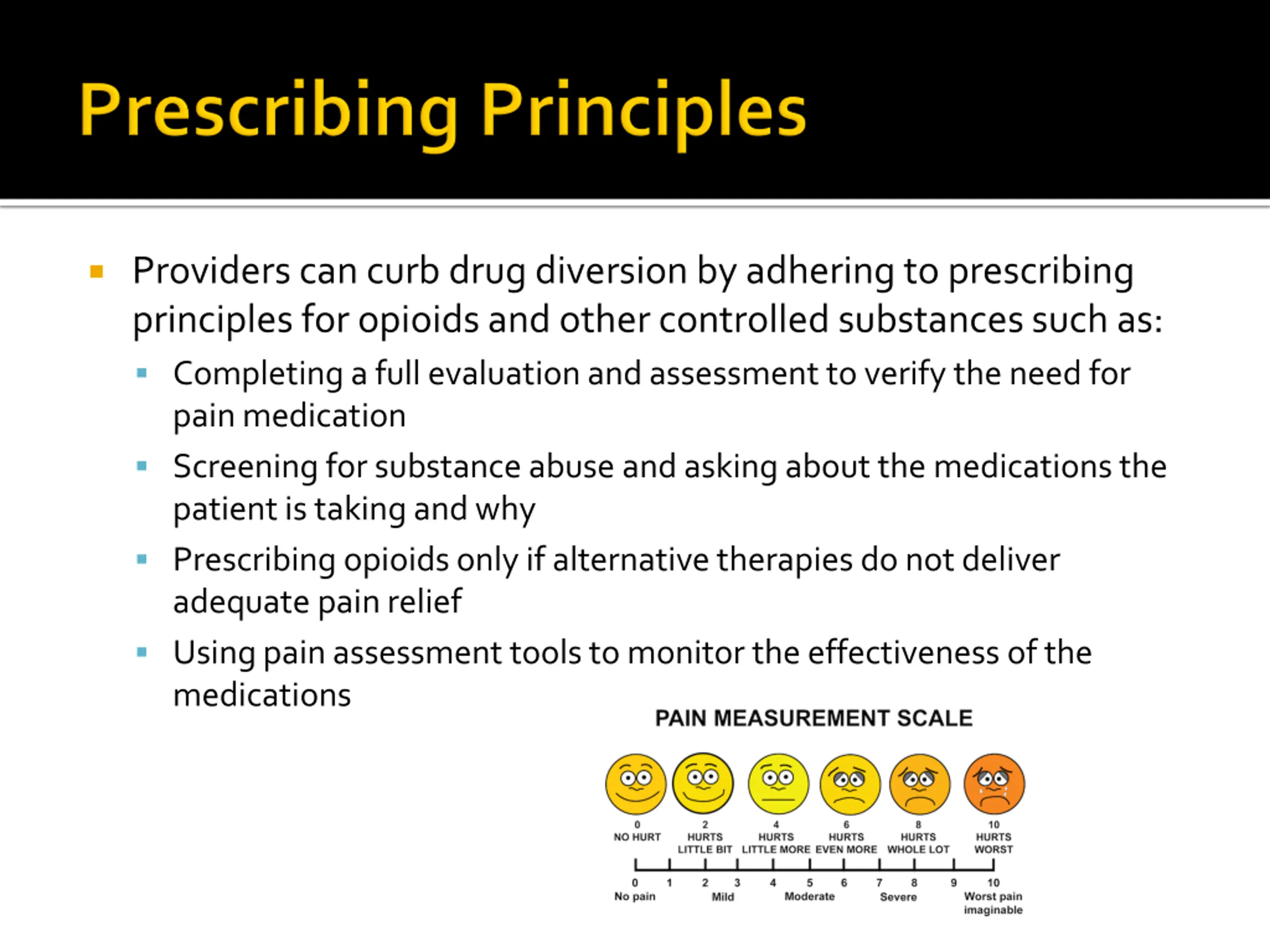 Providers can curb drug diversion by adhering to prescribing principles for opioids and other controlled substances such as: Completing a full evaluation and assessment to verify the need for pain medication Screening for substance abuse and asking about the medications the patient is taking and why Prescribing opioids only if alternative therapies do not deliver adequate pain relief Using pain assessment tools to monitor the effectiveness of the medications