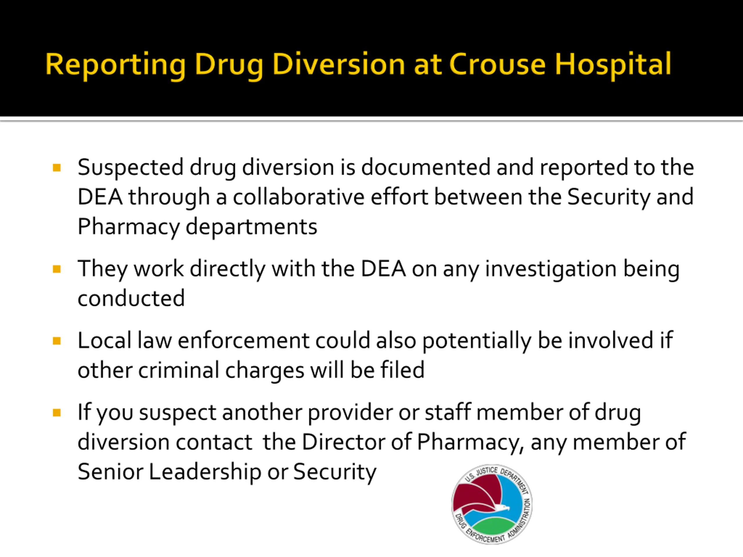 Suspected drug diversion is documented and reported to the DEA through a collaborative effort between the Security and Pharmacy departments They work directly with the DEA on any investigation being conducted Local law enforcement could also potentially be involved if other criminal charges will be filed If you suspect another provider or staff member of drug diversion contact the Director of Pharmacy, any member of Senior Leadership or Security